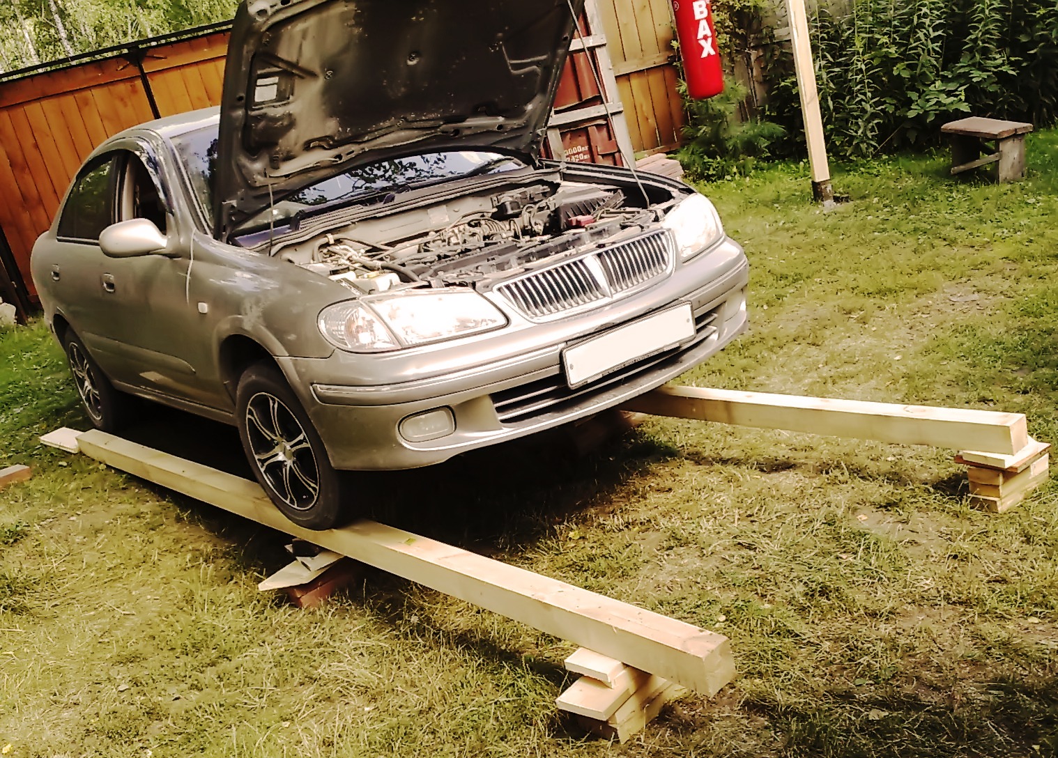 Загоняем машину на яму/эстакаду. Если нет ни того ни другого, то можно воспользоваться подручными средствами и соорудить такую конструкцию =)