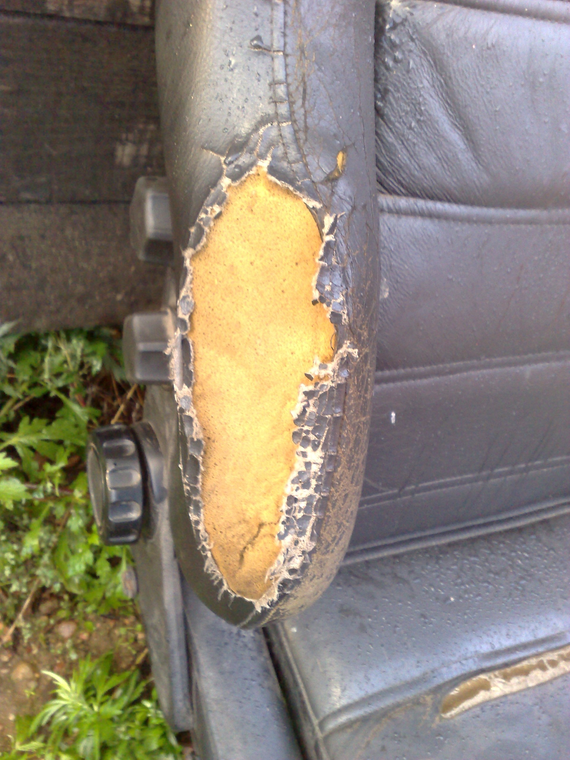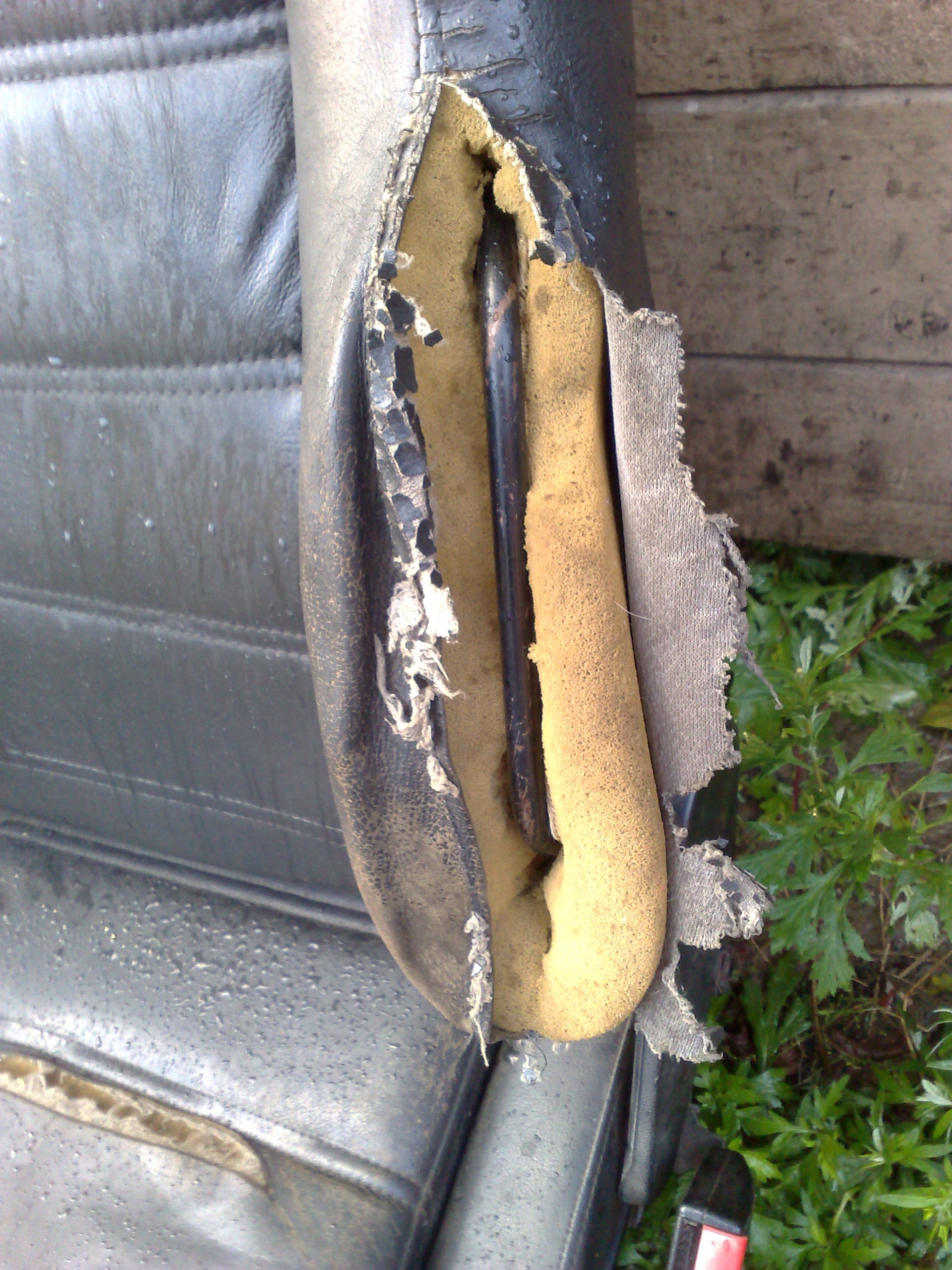 Следующим этапом было восстановление водительского сиденья, где одна боковая поддержка была разодрана до металла (отсутствие кожи и параллона), вторая тоже была разодрана ( нехватало паралона и кожи). С этим делом мне помогала бабушка. Точнее всё делала она. Что было сделано, был приобретён параллон, и из него изготовлена нужная форма. Довольно сложная работа, нужно было создать определённую плотность, схожую с заводской, чтобы не чувствовалось металла, да и поддержка была поддержкой а не кашей. В итоге всё это у неё получилось. Далее были вставлены кожаные клинья, между разрывами. Всё это дело стянуто. И сверху латка из чёрной кожи. Со второй поддержкой почти то-же самое проделывалось. В итоге сиденье провело дома у бабушки более месяца. Вот фото процесса работы: