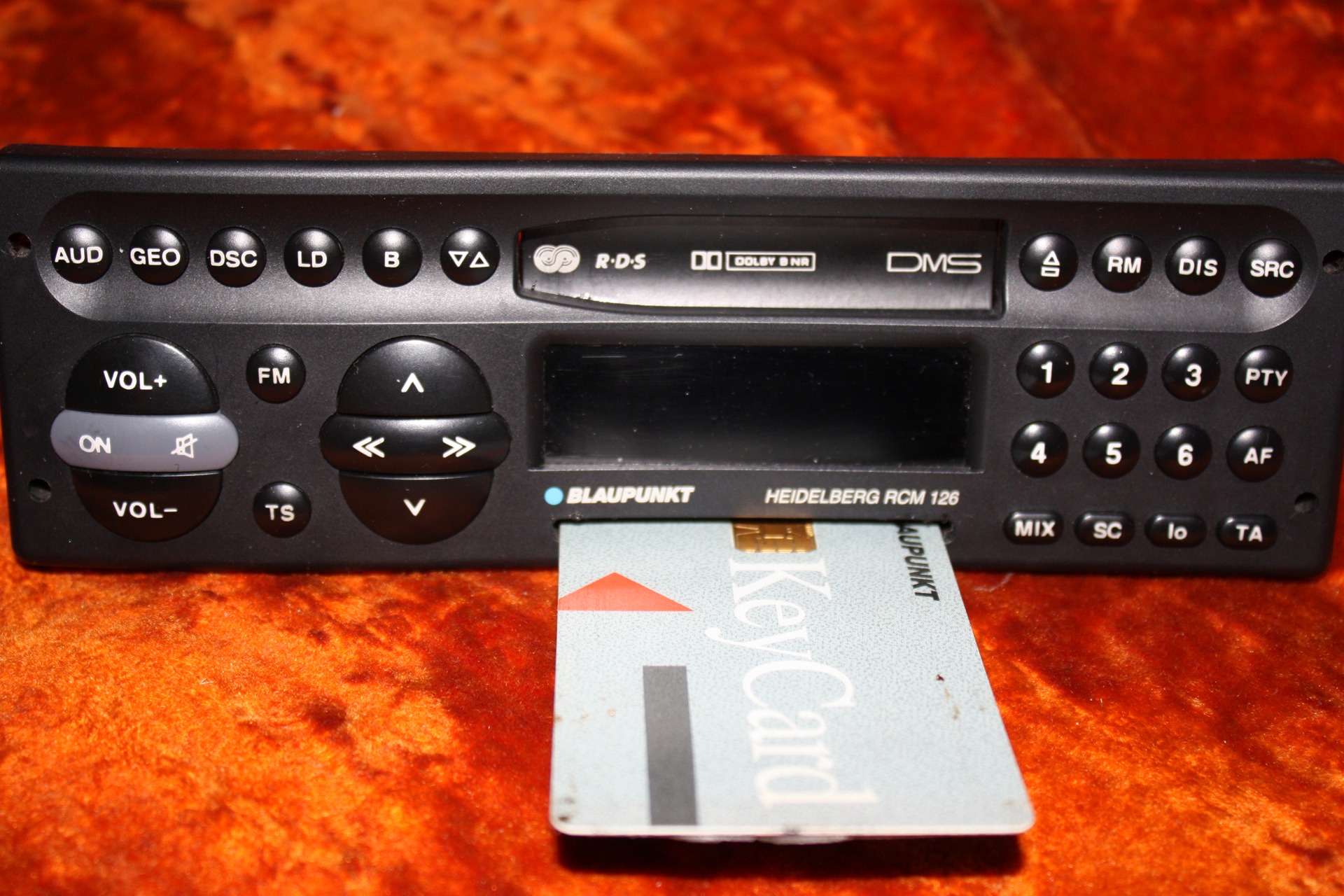 В машине была установлена кассетная магнитола "BLAUPUNKT heidelberg rcm 126" с Key Card защитой. Качество звука среднее, в матричном дисплее не горят две строки, при включении громкость устанавливается на максимальном уровне (сломана пружина микропереключателя), кассета, как носитель, устарела.