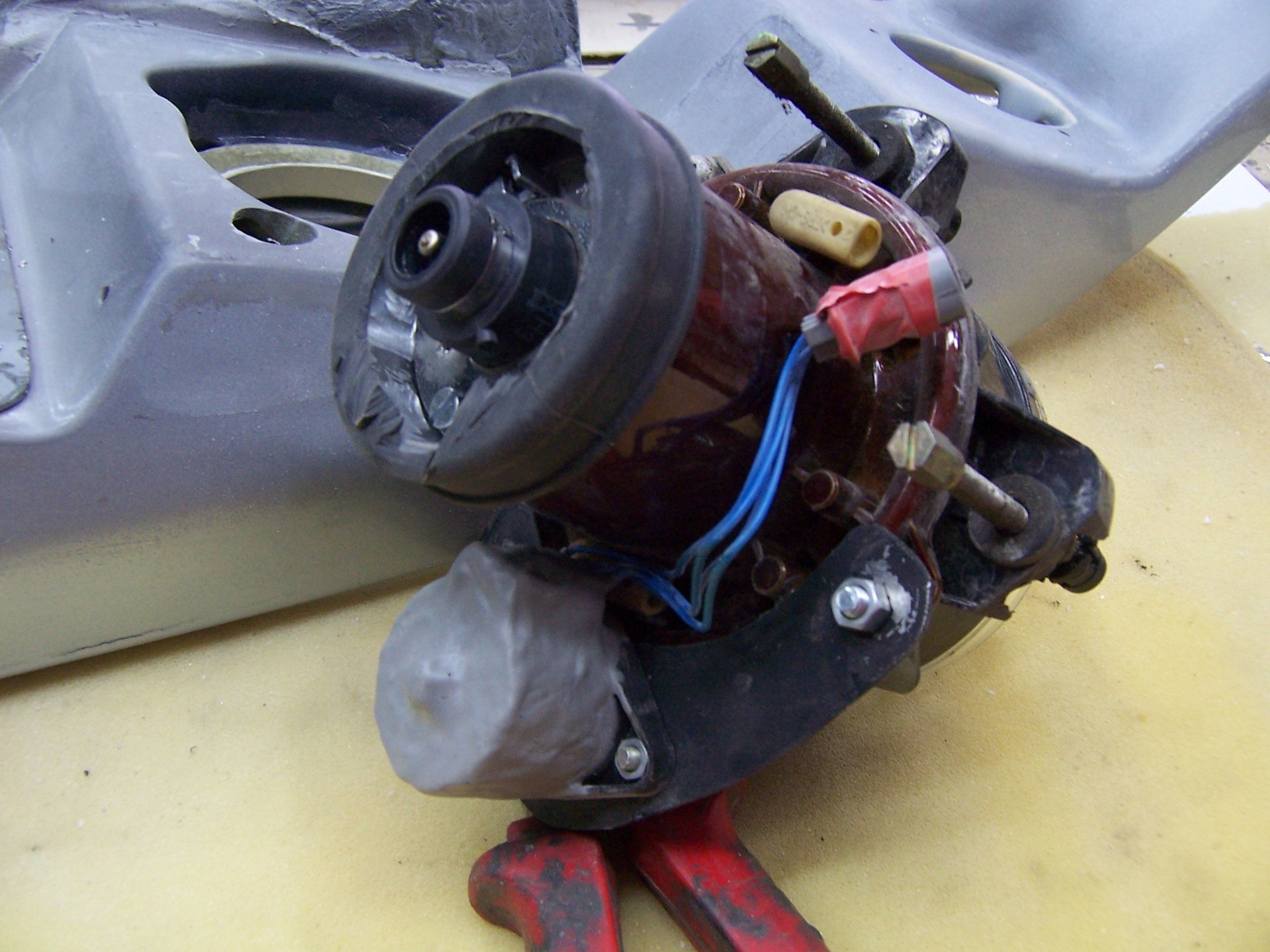 У снятого модуля пришлось срезать ещё одно ухо крепления и установить на его место пластину которая станет переходным звеном между модулем и корректором. На корпусе корректора имелись трещины от аварии, поэтому быстренько соорудил из стеклопластика герметичный саркофаг и загерметизировал его в месте крепления к переходной пластине стекольным клеем.