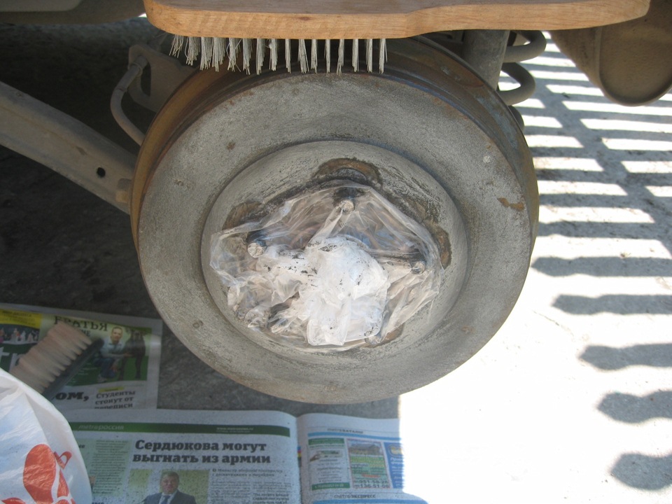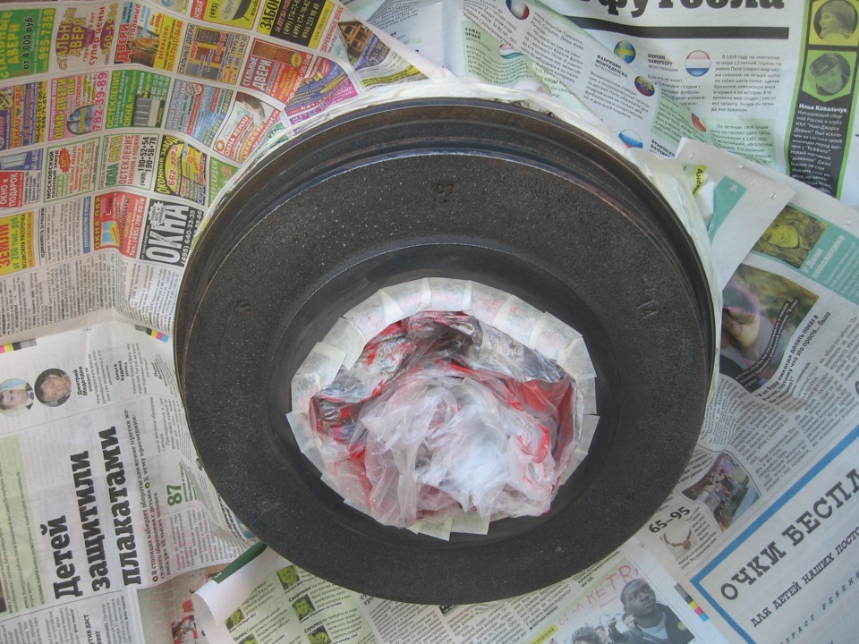 Подготовительная часть – очистка барабанов от смазки, грязи и ржавчины. С помощью пакета прикрываем центральную часть от попадания туда грязи при очистке поверхности барабанов.