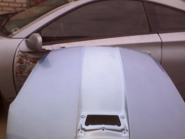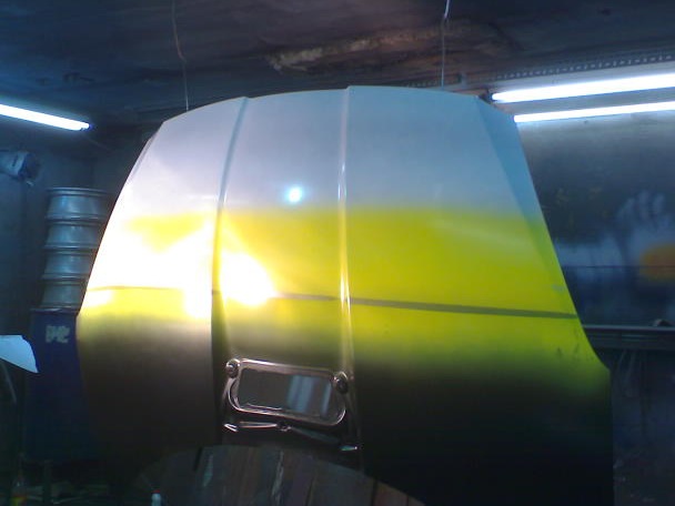 недели 2 было потрачено на выбор цвета, ездил по подборам, брал интересующие цвета по 100гр, привозил приятелю и он изголялся над моим старым капотом как мог) разные оттенки на разные подложки) в итоге было около 15-20 тестовых покрасов капота)