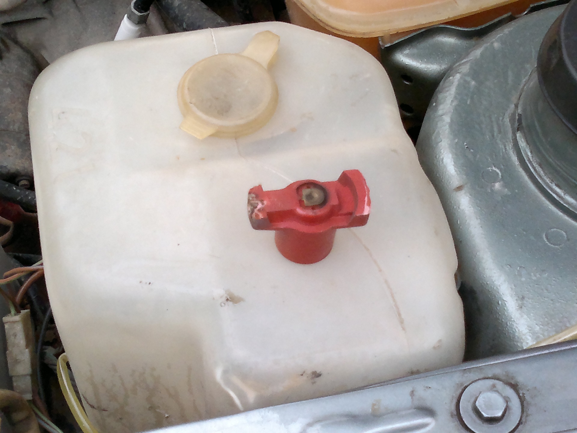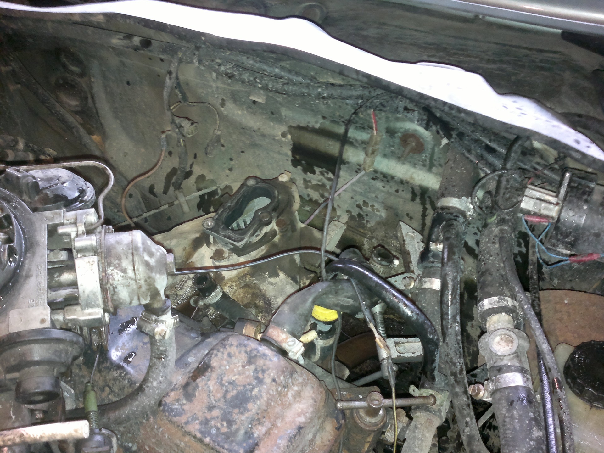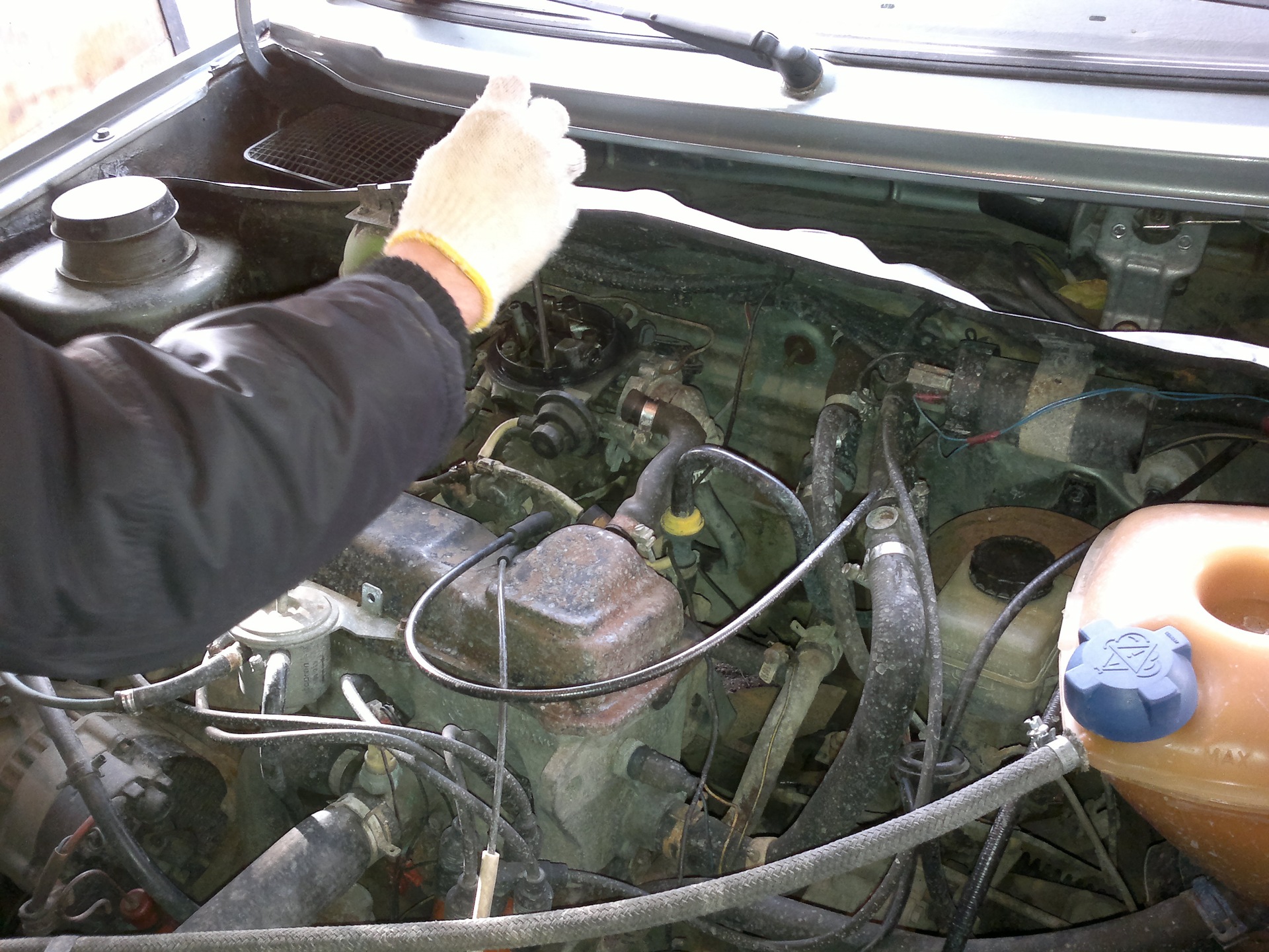 Первым делом мы полезли откручивать многочисленные шланги и вынимать разъемы. Из одного шланга кааак хлынет горячий тосол. Коллективным разумом было решено, что это подогрев карбюратора, и что шланчик надо пережать струпциной. Что было сделано. Крышку расширительного бачка ослабили, давление спустили, и фигачить вроде перестало. Далее пережали второй шланг, который соединялся с трубкой, идущей в печку. А если печка в этом автомобиле находится высоко, то тосола можно было потерять неприличное количество. Но шланг мы пережали, и из него ничего даже не капнуло.