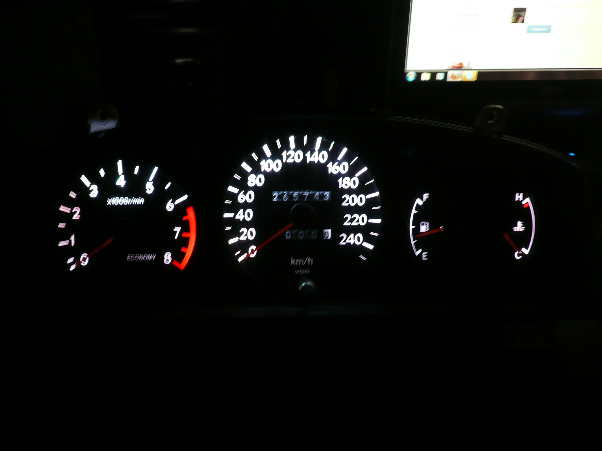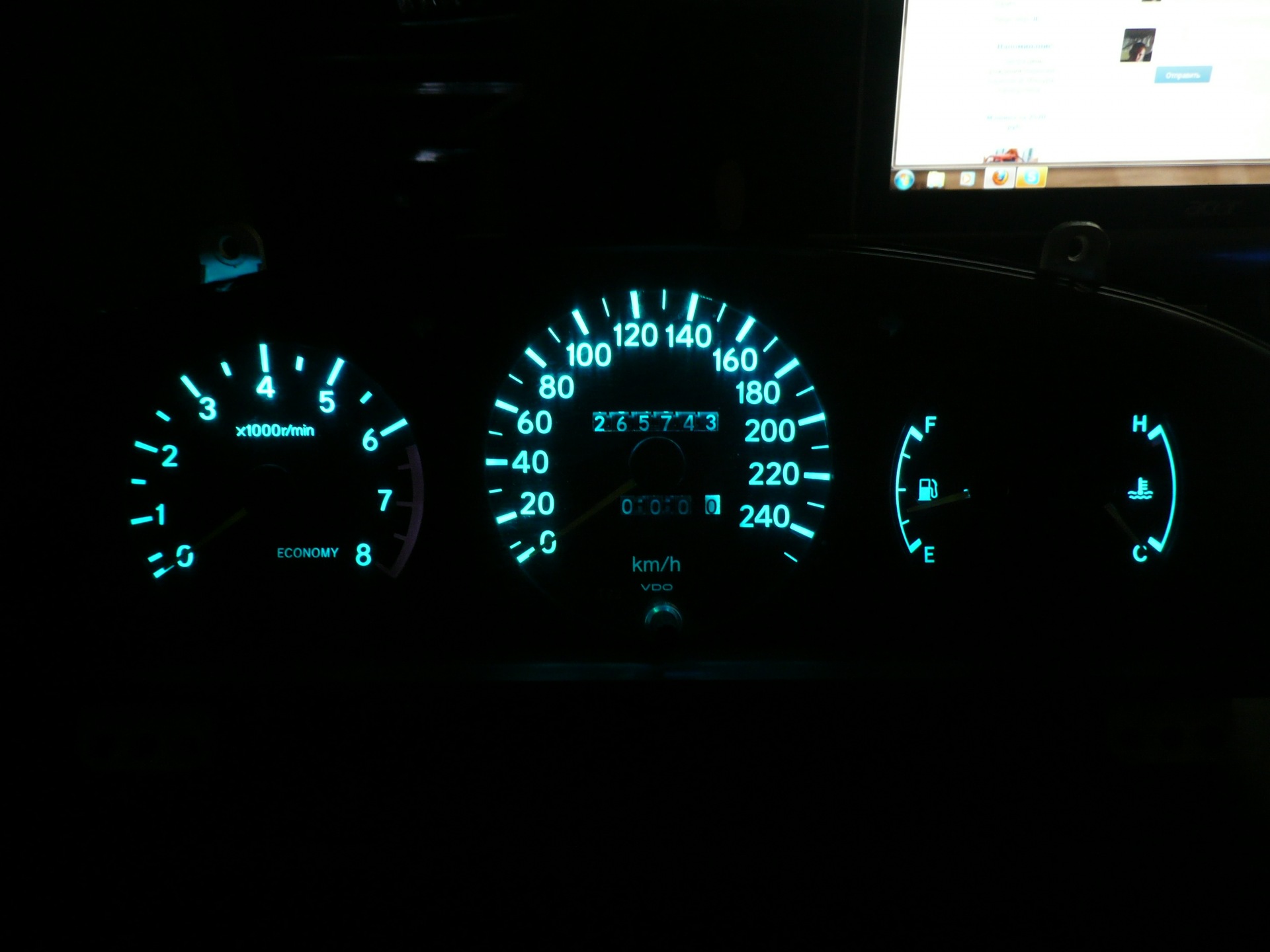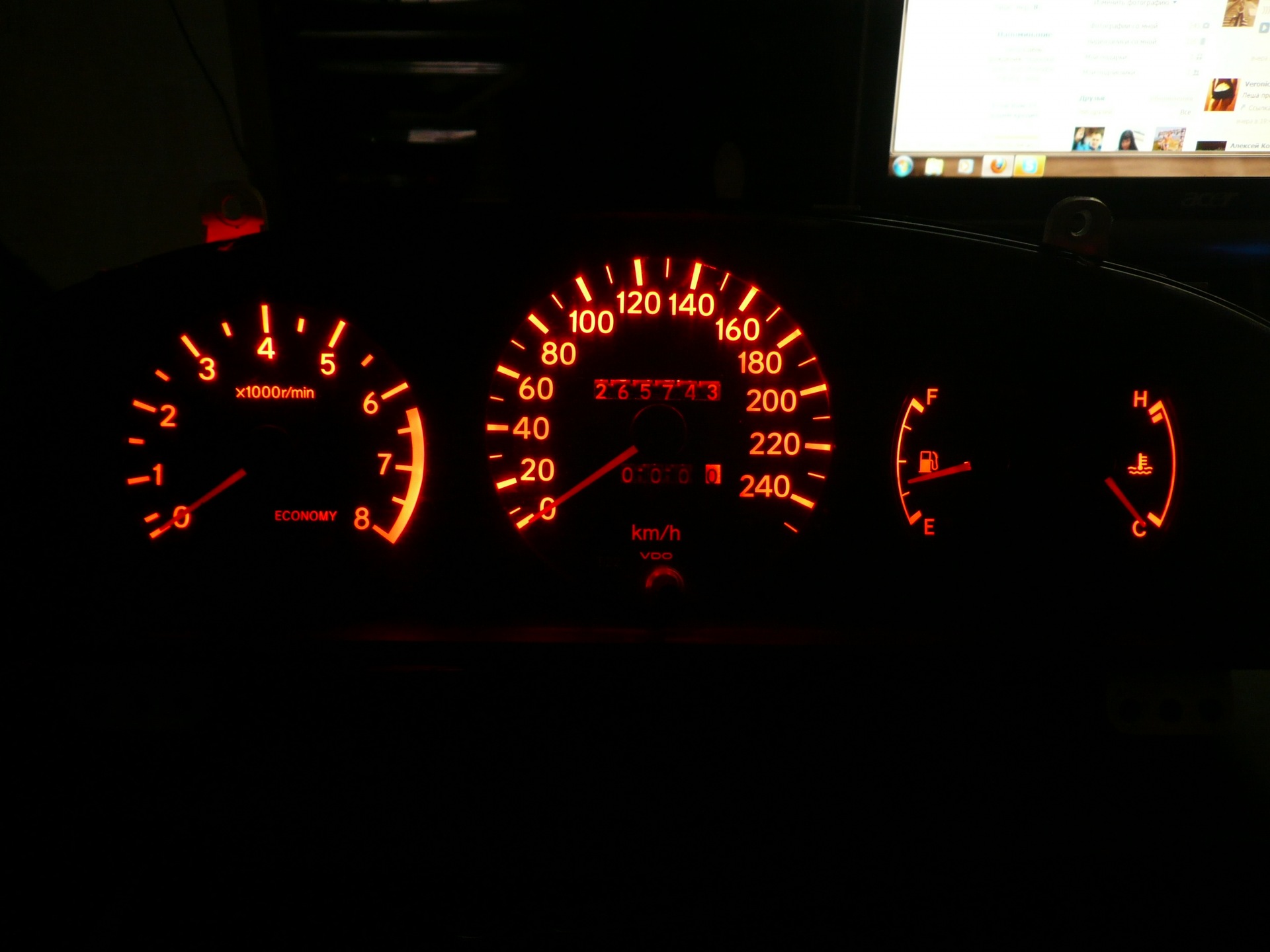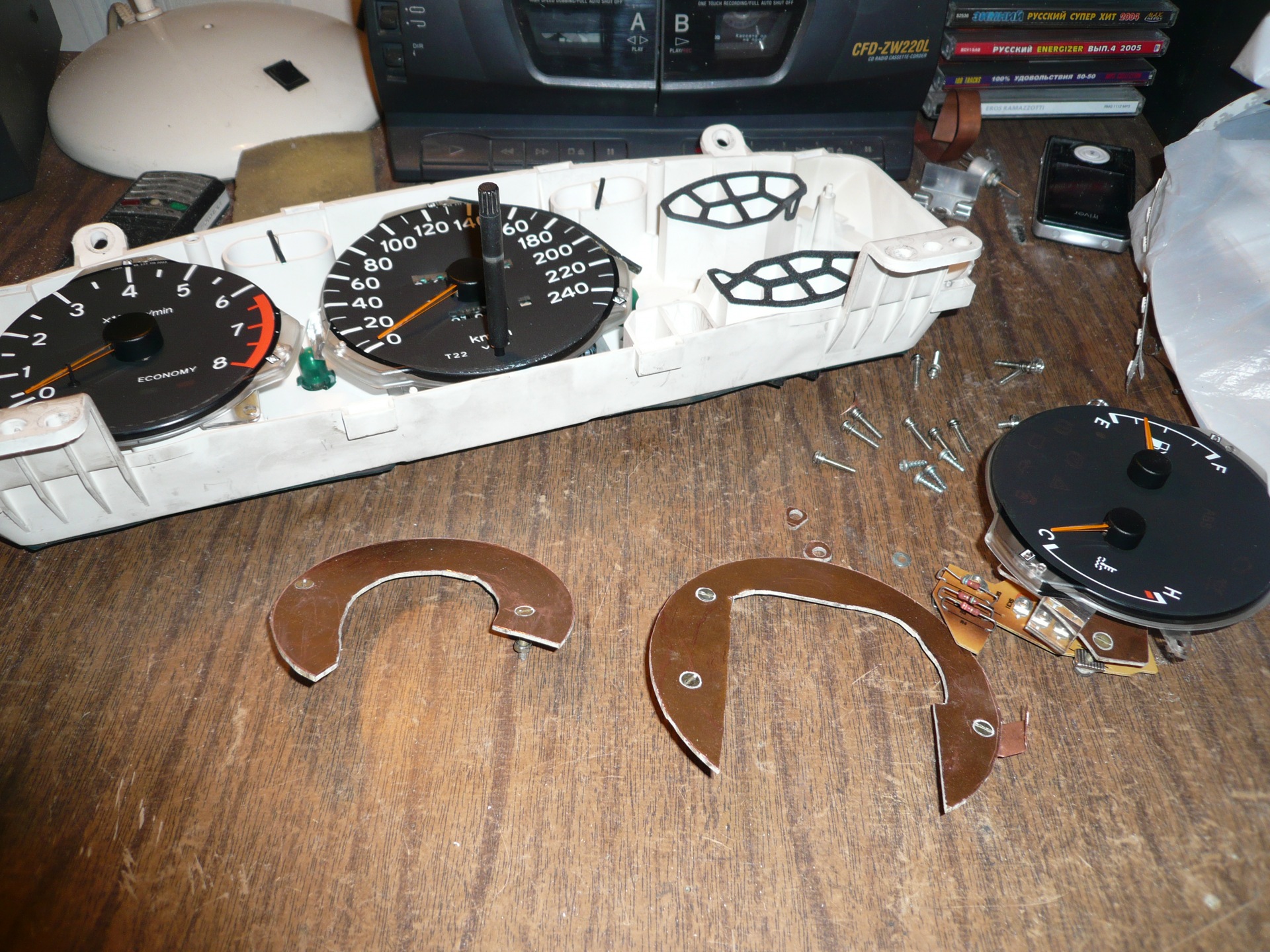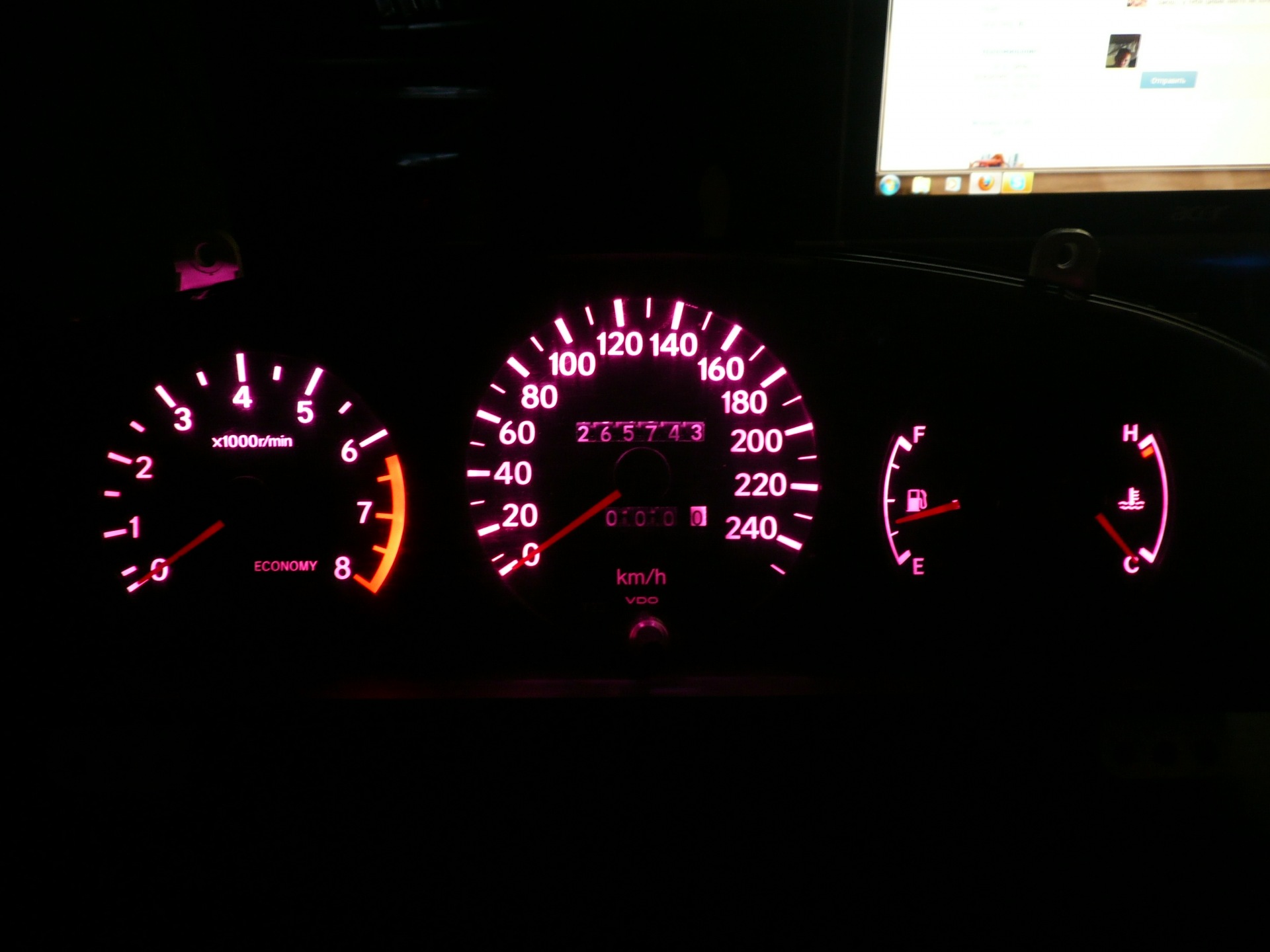 Всё началось с обычного желания сделать подсветку другого цвета ), сначала хотел просто белую, потом уже пришла мысль сделать подсветку на RGB ленте. Ещё была мысль сделать отдельную подсветку стрелок, что бы по мере набирания оборотов стрелка меняла цвет от зелёного до красного, но для этого пришлось бы снимать штатный световод и на его месте монтировать на текстолитовой плате чипы RGB светодиодов. От этой идеи я отказался т.к. не хотелось ничего ломать стандартного, да и повредить приборы побоялся. На каждый цвет поставил отдельный переменный резистор номиналом 1 кОм, "минус" взял после стандартного димера так что общая яркость немного регулируется им ), "плюс" взял с патрона лампочки. Поставил схемку плавного включения, вот только плавное выключение не получилось ) А так вроде прикольно получилось, на светофоре стоишь играешь с оттенками цветов ))