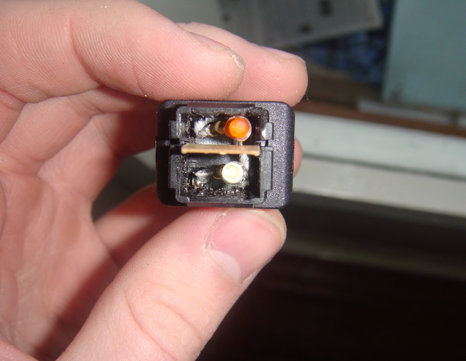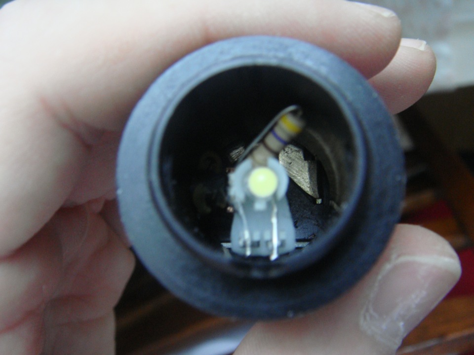 Следующей задачей стала ручка переключения режимов вентилятора.Там стоит обычный 3мм светодиод, Он там не припаян, а просто ножки зажаты в "щипцах". Разжимаем щипцы, достаем старый диод и устанавливаем туда новый яркий светодиод, ничего сложного.