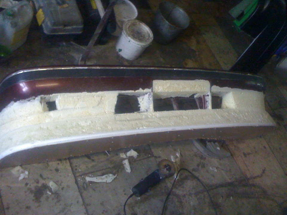 Начали с заготовки из монтажной пены, Роман придал ей форму бампера, далее пошла штукатурка гипсовая, для придания плоскостей и выравнивания их, получилась болванка в натуральную величину, далее с нее снимается промежуточная матрица, по ней выклеивается стеклопластиковый бампер, пробник так сказать. Пробник выравнивается, режется, пилится, подгоняется, склеивается, страдает по полной, вот с него уже снимается матрица, по которой делаются бампера, ровные и готовые к употреблению.