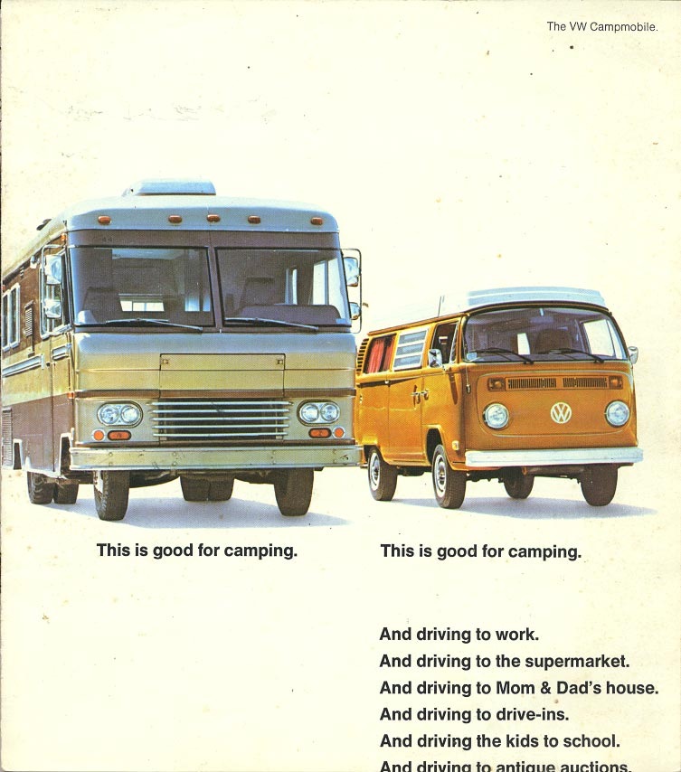 К сожалению, Москва не особо располагает условиями для обладания здоровым автодомом, да и практичность "немного" страдает… Что прекрасно иллюстрирует отличная обложка рекламного проспекта 1976 года “Volkswagen T2 Westfalia Campmobile”, не потерявшая актуальность и сегодня :