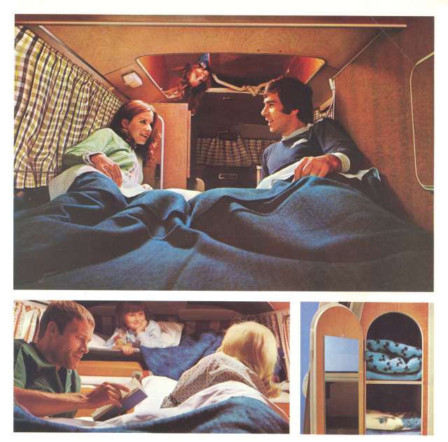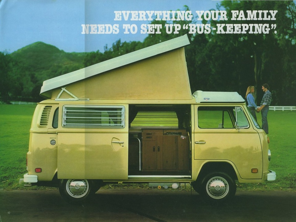 Как можно увидеть на фотографиях – у бусиков, опять же, начиная с Т2, также появляется полноразмерная подъёмная крыша. Эта опция, которую можно было выбрать, заказывая свой VW Westfalia, увеличивает пространство внутри бусика — очень полезно во время приготовления обеда :), а во время послеобеденного или вечернего отдыха там появляется спальное место для ребятёнка (до 1973 года, поднимается передняя часть крыши, «по движению», модели T2a) или два спальных для взрослых (с 1973 года, поднимается задняя часть крыши, «против движения», модели T2b)