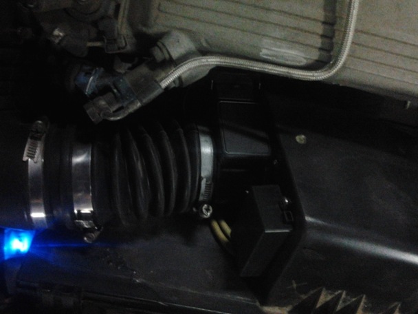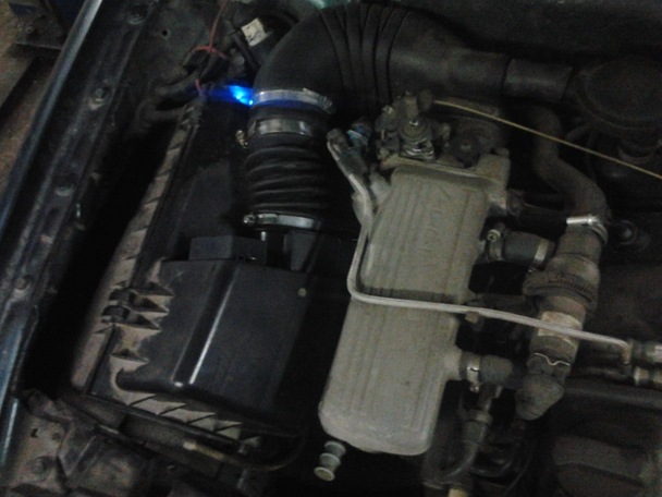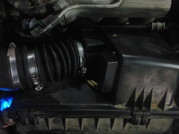 Снял с крышки воздушного фильтра родной расходомер, смотрю, а там отверстие квадратного сечения, а у датчика от Волги оно круглое, поэтому не долго думая, отметил окружность на крышке, и приступил к выжиганию окружности паяльником. потом все подравнял зачистил, примерил датчик, входит плотненько, то что мне и нужно, вставил датчик залил герметиком внутри и снаружи, прикрепил дополнительно саморезами с пресшайбой. натянул пыльник стойки на свободный конец датчика, притянул хомутом, теперь осталась электрическая часть. В это вдаваться не стану, кому нужно, тот поинтересуется.
