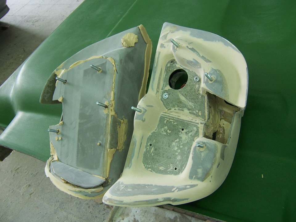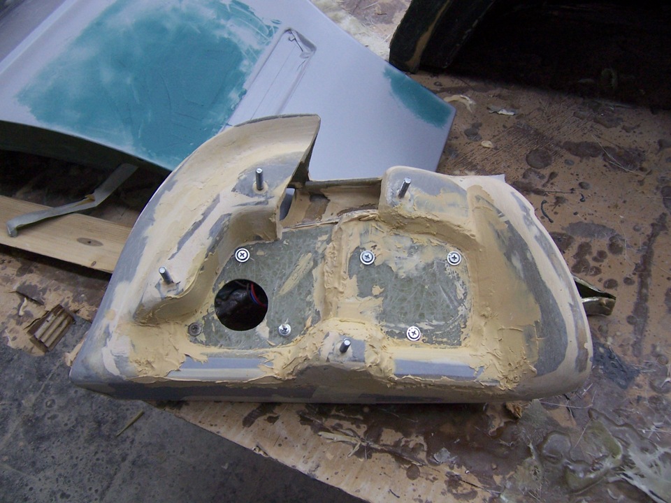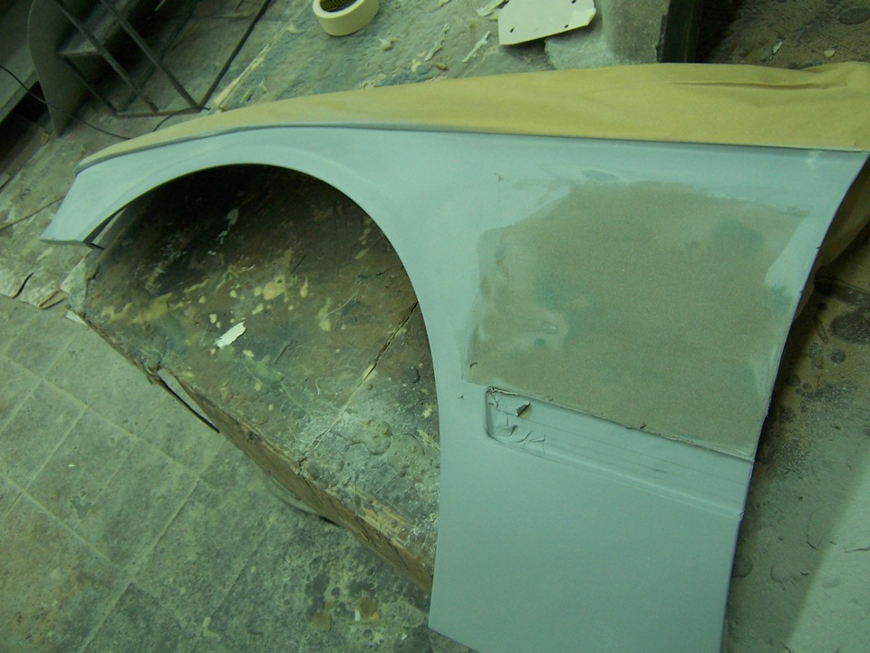 Ну а пока есть промежутки когда сохнет шпаклёвка(сегодня у нас холодно и сыро и с раннего утра работа стала растягиваться), занимаюсь подготовкой крыльев к покраске. Вчера заварил места под повторители и хотя очень старался ненагревать место сварки, металл всёже повело… И как-то выстучав придал первоначальную форму, отнёс для покрытия кислотным грунтом. Сегодня грунт просох и можно шпаклевать крылья.