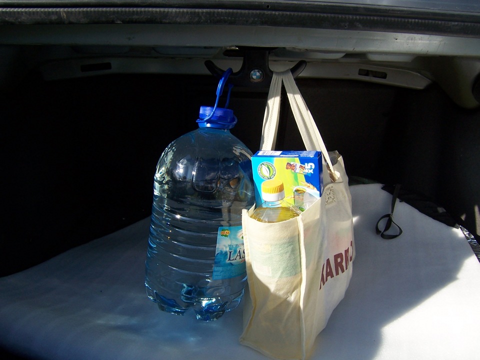 Кто часто пользуется машиной для шопинга меня поймут. В БМВ сумки положить некуда. Можно тупо скидать на задний диван, но последнее время и он у меня обычно занят, поэтому только багажник. Ну а в багажнике имеется с левой стороны крючок-открывашка люка. Но вопервых несколько сумок туда неповесишь и при езде они всё равно иногда соскакивают и их потом собираешь по всему багажнику, да и всё что из них рассыпалось :(