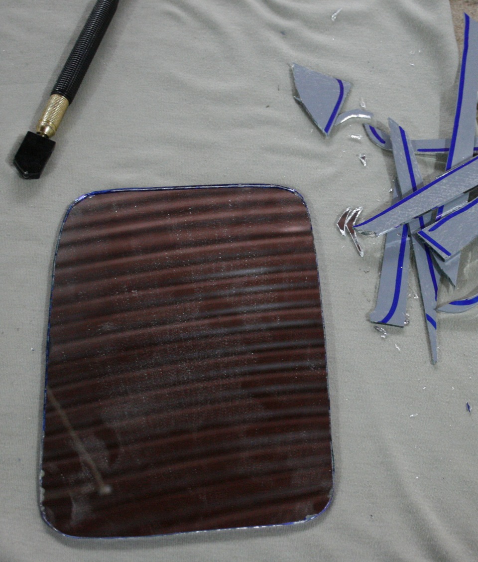 я прикладывал старое зеркало в сборе, очерчивал и потом вырезал стеклорезом, подгонял уже наждаком, приклеевал на родное зеркало герметиком чтоб не разломать пластик.