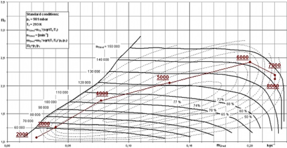 Это получается она на 3 т. Только начинает разлучаться а к 5 т. Выходит на полный буст правильно? И на 1.4 бар примерно 750 кг воздуха, что примерно 250 сил.