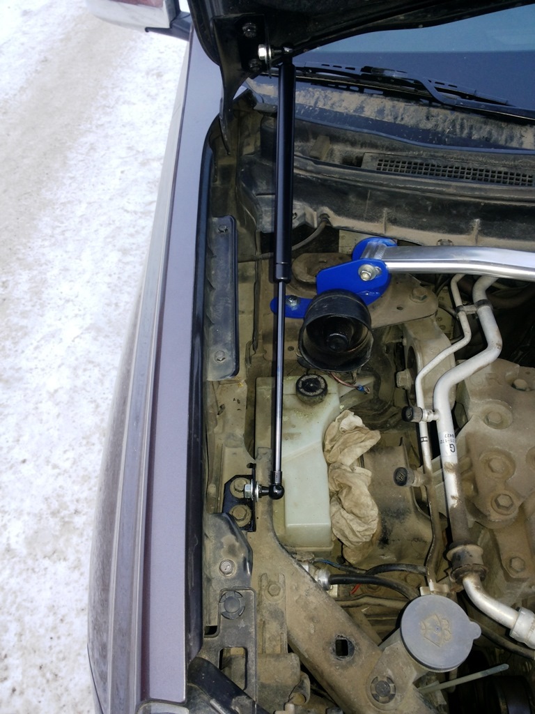 Вообщем поставил. Доволен. Упоры "самопал", делали на заводе знакомые, Покрасил сначала грунтовкой потом 2 слоя краски, все из балончика. Гидравлика от 2108 купил в Экзисте за 420 руб . оба. Поставил за 15 мин. Чертежи "свиснул" у кого то в сети. Капот не выпирает, палка теперь не нужна.