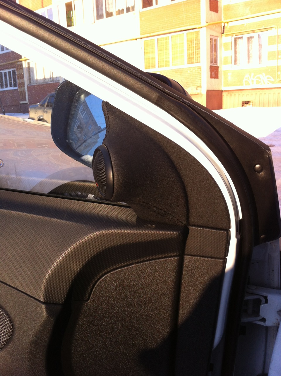 Из заголовка в принципе все понятно. Хотел сделать чуть ближе к заводскому виду и разместить твитеры в уголках дверей. Как таковых пищалок у меня не было в моей комплектации, вместе с установкой мидбасов Morel tempo 6, занялся и изготовлением подиумов. В принципе процедура обычная: каркас, колготки, эпоксидка, стеклоткань, волосянка и потом уже финишная. Обшито биэластиком (исскуственная кожа).