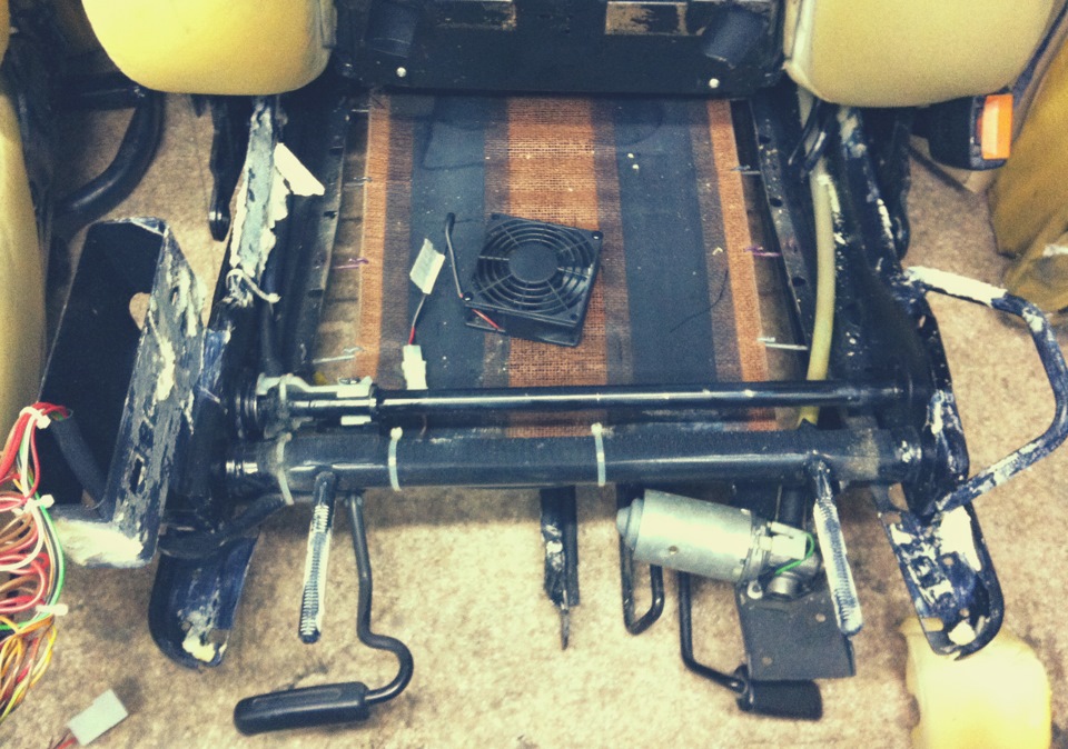 А вот, внимание, вентиляция сидений. Вентилятор 80х80 — это для жопной части наездника и такой же для спины. Но в спину дует через систему воздушных каналов в трех местах