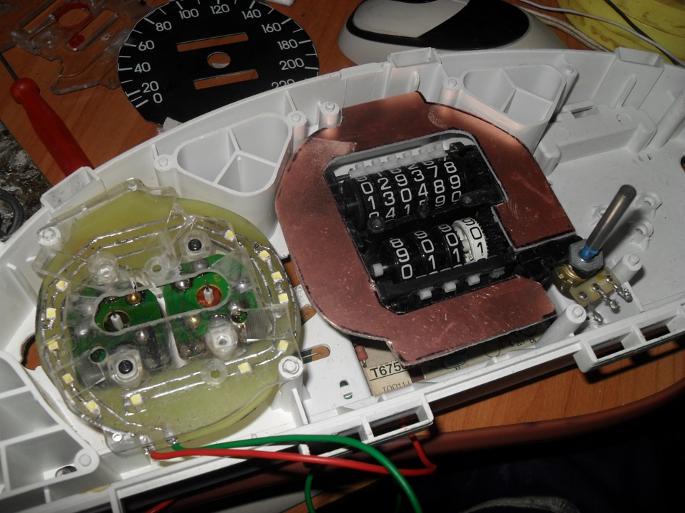 много работы проделано, а результат не стоит такой мороки. После замены обычных лампочек на диоды, светило лучше чем с платой. не пойму почему тебя не устроил вариант с лентой? Сегодня поставили ленту с напарником, но без тахометра. Светит идеально ровно, кроме участка 100 и 120 км. Потом что там нет напыления. Нужно наклеить скотч в 2-3 слоя или замазать маркером и свечение равномерное по всем стрелкам. Но свет не супер яркий. Чтоб был супер яркий нужно удалять напыление со всех шкал. Нас устроил такой цвет. Так как регулятор яркости ставить не планируем