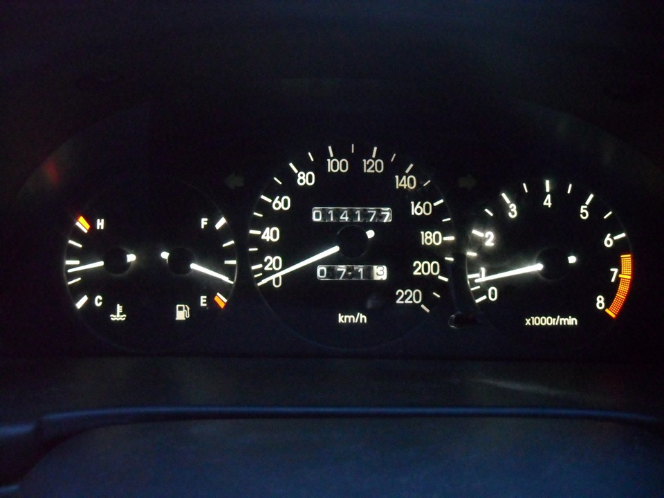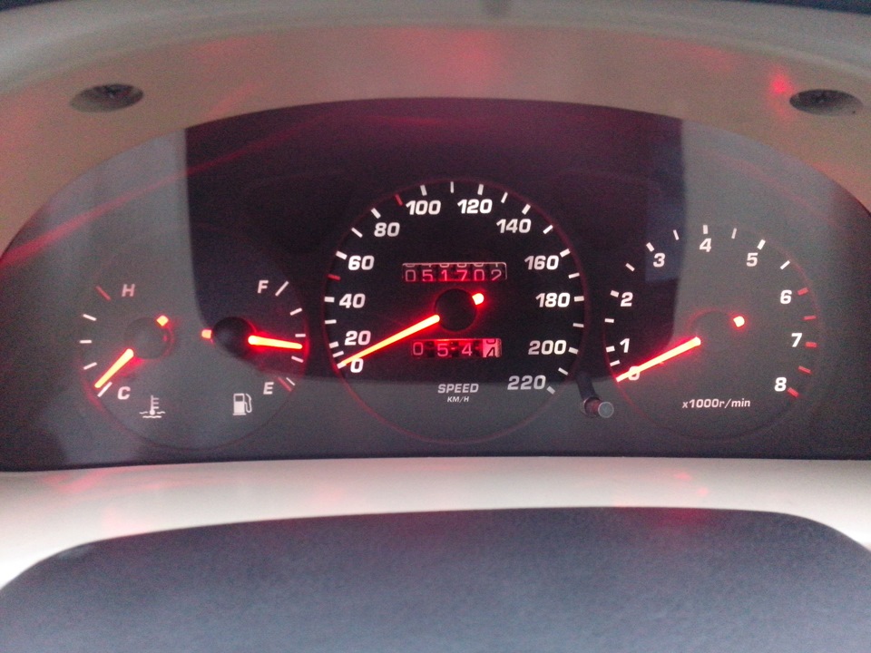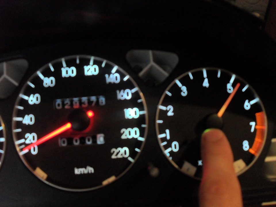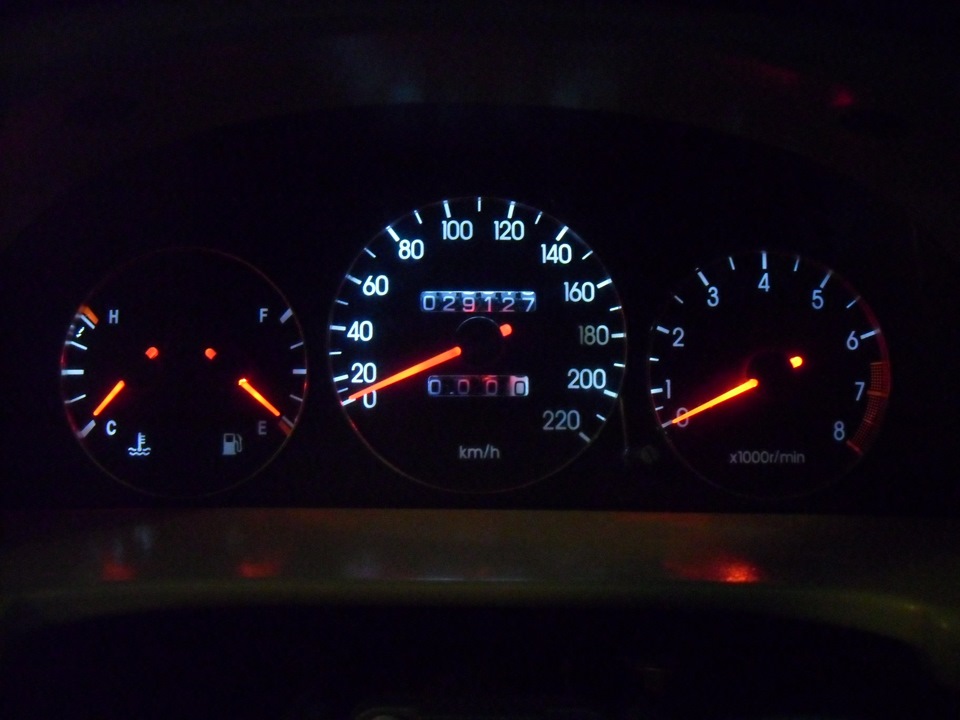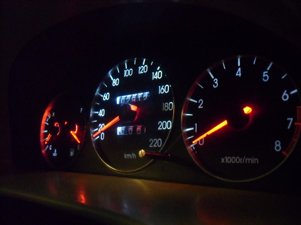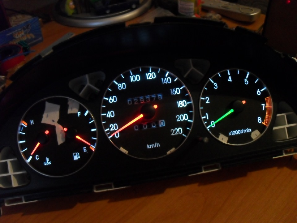 Так как машина базовой комплектации, то понятное дело, что приборной панели с тахометром там не было, как и много другого, что есть сейчас.Почти с момента покупки, было желание приобрести новую панель.Полазив по разборкам, по форумам, была найдена приборная панель с тахометром, по более менее нормальной цене и состоянии.В то время отдал за неё около 550грн. Первым же делом, хотелось поменять подсветку, потому как родной зеленый цвет выглядит не особо.Для это были куплены светодиодные лампочки.Но в связи с тем, что три лампочки большие, а одна идет меньше, пришлось цоколь диода немного подрезать.После установки диодов получаем примерно следующее: