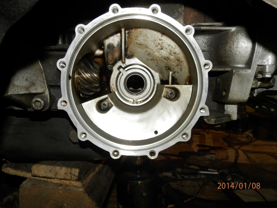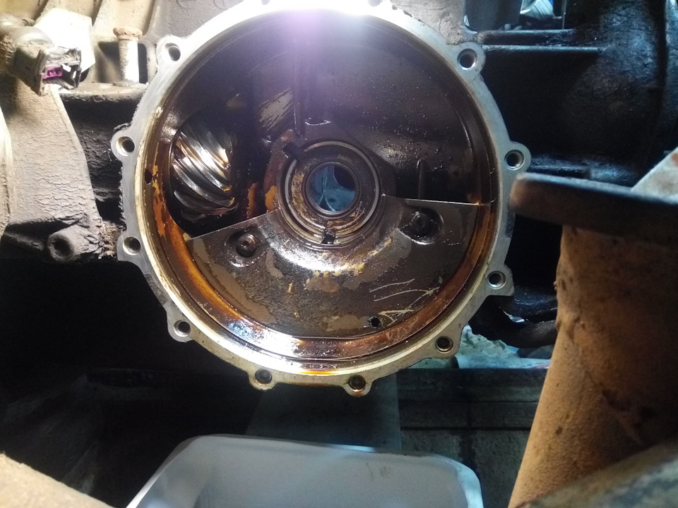 Далее переходим к крышке корпуса дифференциала. В ней находится сальник правого фланца Тщательно все чистим от грязи и старого масла. Кстати хорошо видно, что сливной пробки нет.