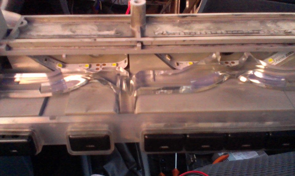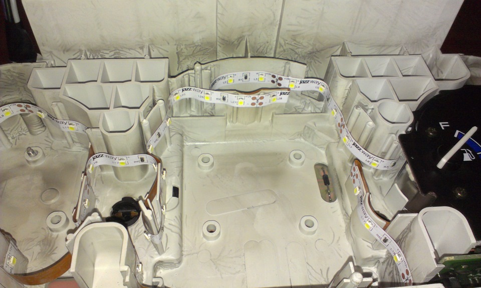 Затем наклеил ленту по периметру приборки. Я стараюсь по максимуму сохранить стоковое состояние и возможность отката назад. Поэтому ни какие перегородки не выламывал, только лента.