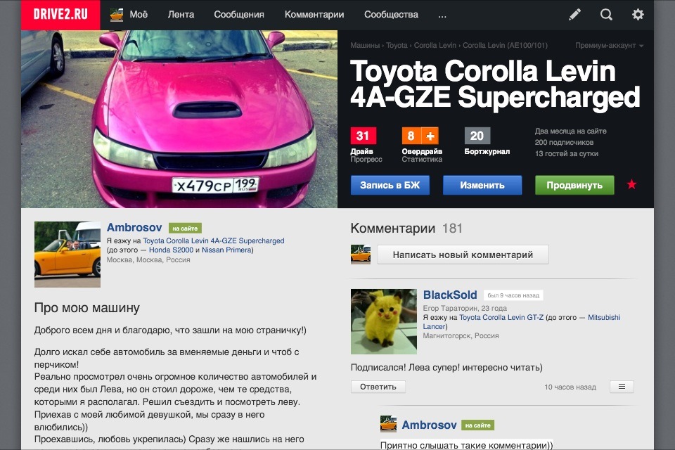 Даже когда заходишь в 101 кузов Левинов, моя машина красуется наряду с достойнейшими автомобилями! Конечно некоторые более крутые проекты по непонятным причинам имеют меньший доайв, но думаю это поправимо)