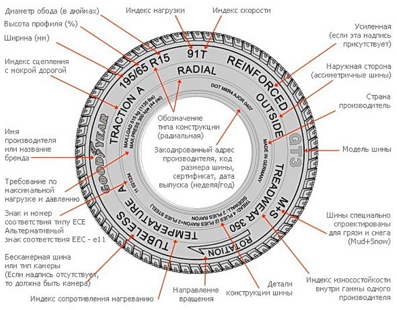 1 — Обозначение размера шины. 2 — Модель шины. 3 — Наименование предприятия-изготовителя. 4 -Товарный знак предприятия-изготовителя. 5 — Страна-изготовитель. 6 — Индекс несущей нагрузки. 7 — Категория скорости. 8 — Обозначение "TUBELESS" для бескамерных шин. 9 — Обозначение "ALL SEASONS" для шин с всесезонным рисунком протектора. 10 — Знак Е с указанием номера официального утверждения и страны, выдавшей сертификат соответствия Правилам ЕЭК ООН. 11 — Дата изготовления — 4 цифры, где 2 первые -номер недели, 2 последующие — год изготовления шины. 12 — Обозначение технических условий. 13 — Порядковый номер шины. 14 — Обозначение места расположения индикаторов износа. 15 — Применяемые материалы и число слоев в каркасе и брекере. 16 — Обозначение DOT (Department of Transportation). 17 — Буквенно-цифровой код изготовителя (по регистрации департамента транспорта США). 18 — Код размера шины. 19 — Нормы эксплуатационных режимов для эксплуатации шины в Северной Америке. 20 — Показатель степени износостойкости шины. 21- Показатель сцепления шины с дорогой. 22 — Характеристика скоростной выносливости шины