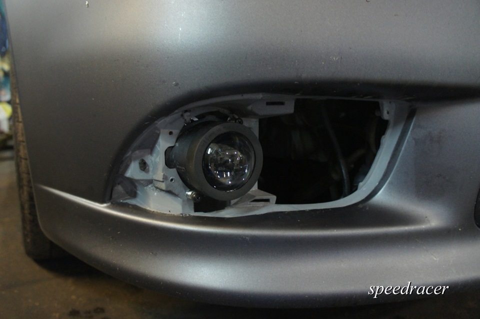 Для установки модулей Hella необходима небольшая доработка бампера. В месте установки штатных ПТФ надо срезать ножом ребра бампера.