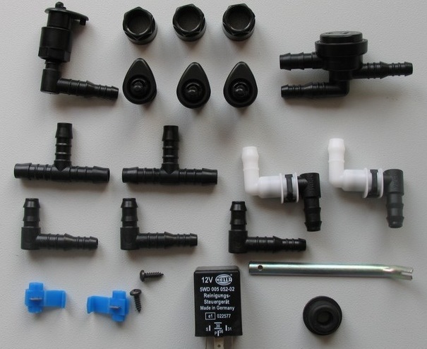 Основным критерием при выборе комплекта было минимум резки, омыватель фар «скиф» отпал из-за прямой форсунки которая подразумевала резку в глубь не только бампера но и поперечины кузова. Hella понравилась качеством (Германия), г-образной форсункой, толстой проводкой, качественным резиновым шлангом и полным комплектом, его и решил установить.