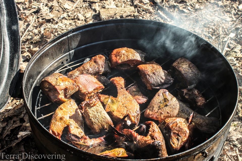 Возвращаемся в наш "лагерь"…Опять релаксируем у костра, гоняем чаи, т.к. сегодня нужно уезжать ввиду обстоятельств…Я копчу форель и горбушу: