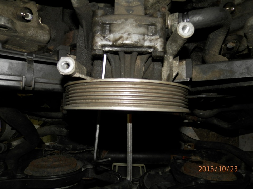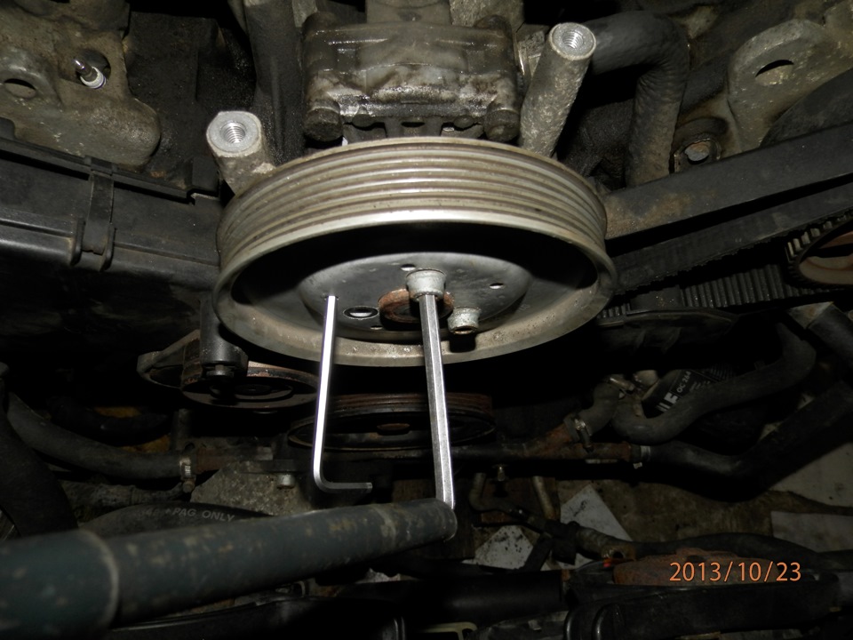 Откручиваем шкив насоса ГУР: можно с помощью спец приспособы либо фиксируя его, как делал я.