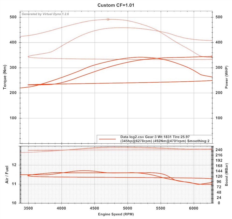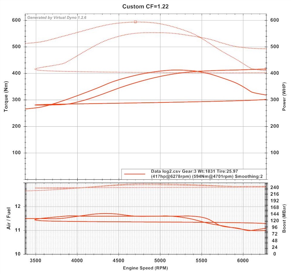 Ну и по логам видим, что в пике имеем 1.5-1.55бара на 4000-5000об/мин. Что есть хорошо, потому, что пик момента сдвинут на более высокие обороты. И 1.45 бара у отсечки, против 1.3-1.32 бар в 2ух-портовом режиме. Прирост по расходу воздуха вырос с 302-305г/с при 15-17С, до 312-315г/с. Полка буста как мы видим ровная, без скачков.