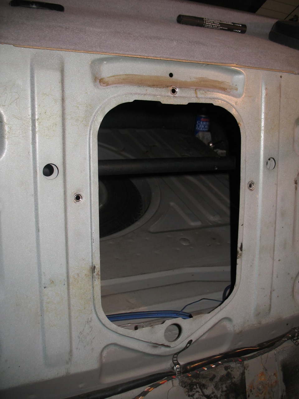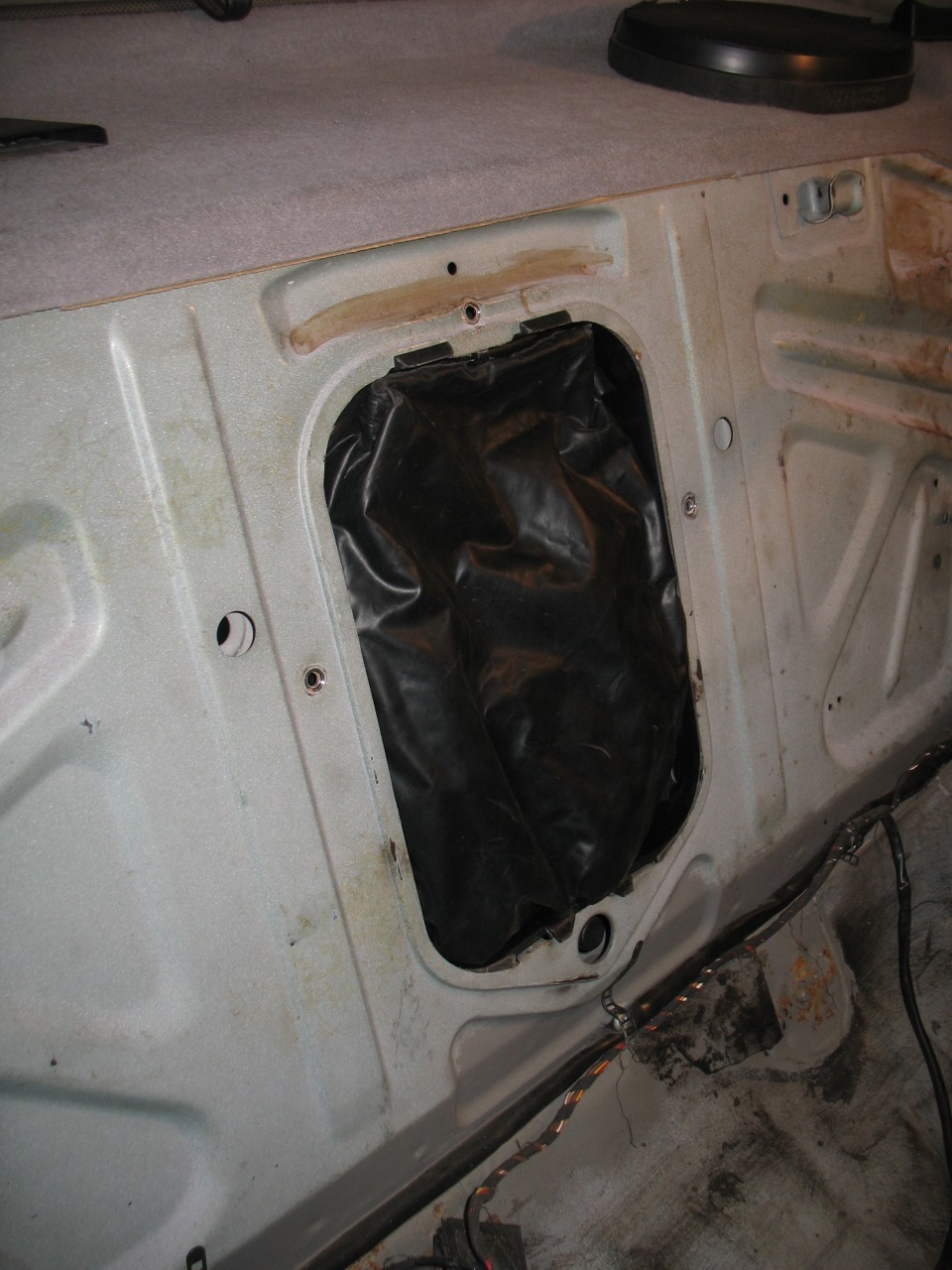 Для установки чехла нужно снять задний диван и обшивку перегородки багажника. Устанавливается он в проем в задней перегородке, который с завода закрыт металлической заглушкой. В моем случае заглушка была уже удалена.