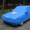 Нажать на круглую кнопку внизу коробки чехла — при этом откроется подпружиненная крышка коробки в багажнике.