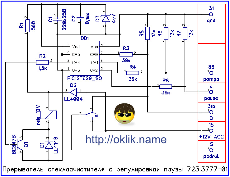 Реле паузы от ВАЗ с маркировкой 411.3777 — от 54.3777 отличается тем, что есть задержка 0.5 сек перед взмахом дворников после полива стекла и три взмаха вместо двух. Проще подключать у разъема в рулевой колонке — 3 провода длиной 60-70 см туда кинул. Там сразу и масса есть (6-ой контакт), поливалка (3-ий контакт) и прерывистый режим (контакт 9). Значительно проще, чем выискивать их в толстом пучке.