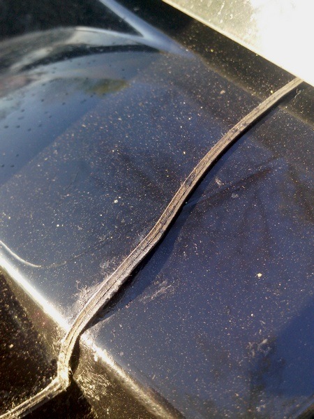 Полоска имеет топоровидный профиль, который влезает в трещину, а сверху её закрывает. Для закрепления резинки на месте пришлось промазать её клеем. Использовап маленький тюбик клей-гель с рекламой растяжения. Делал когда солнце село и пластик разошёлся.