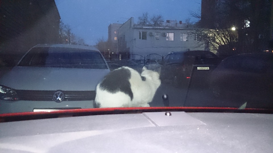 И тут на капот мне плюхается нечто большое, светлое — и сидит. Я фотик в руки, со вспышкой сфоткал — а этой наглой морде хоть бы что!