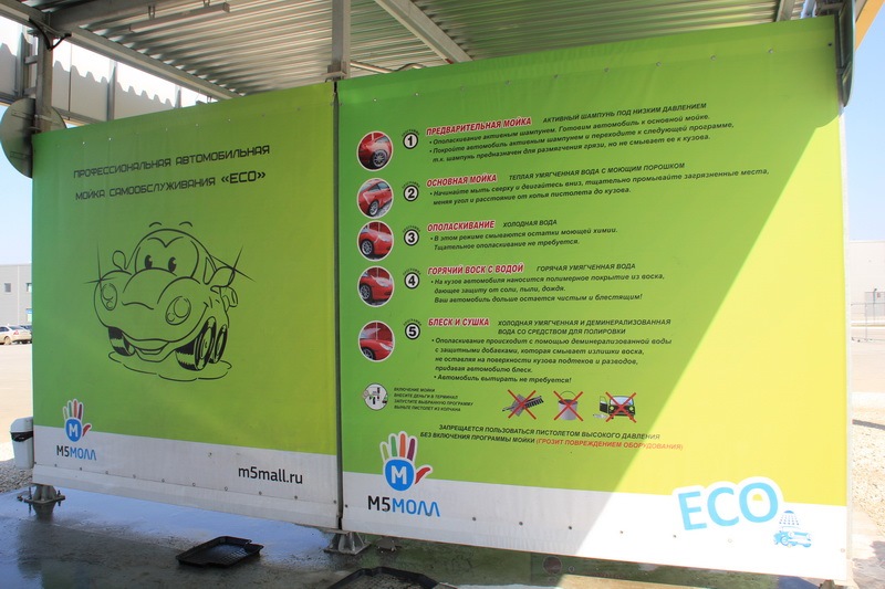 В общем суть такова: мойка запрограммирована на пять режимов работы: «Предварительная мойка», «Основная мойка», «Ополаскивание», «Горячий воск с водой» и «Блеск и сушка». Можно использовать любой режим в любой последовательности, минута стоит 20 рублей.