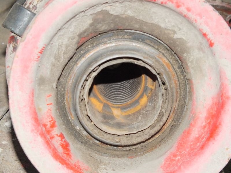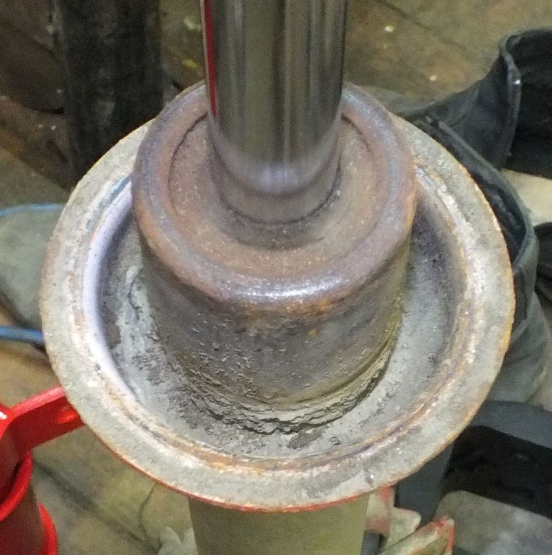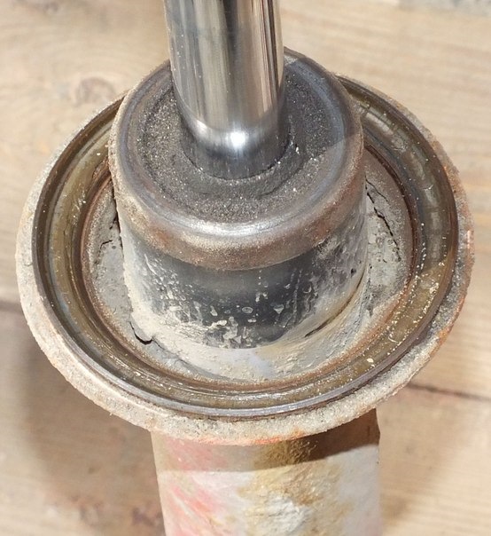 Как результат — "ванна с водой". А вот от туда, вода попадает через ослабевшие уплотнения на крышках верхних чашек стоек, внутрь, где на шток прикручивается гайка, в результате все ржавеет, в итоге при разборе стойки проблемы с выкручиванием гайки.