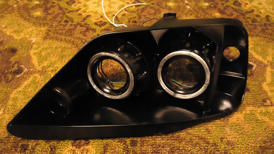 После вскрытия картина не порадовала совсем-никак, все примитивно и очень даже дешево, я бы сказал максимально удешевлено.Ангельские глазки горели очень с трудом, да и были желтые, поменяли устаревшие лампочки на диодики 1.5 V, подключенные через сопротивление на 1Ом по 4 диода в цепи, посмотрим сколько проживет такой расчет.Внутренности покрасили черным так намного красивее.