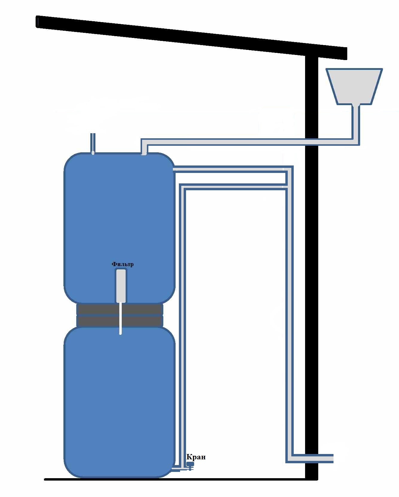 В верхней бочке фильтр и отстойник. В нижней бочке вода чистая.