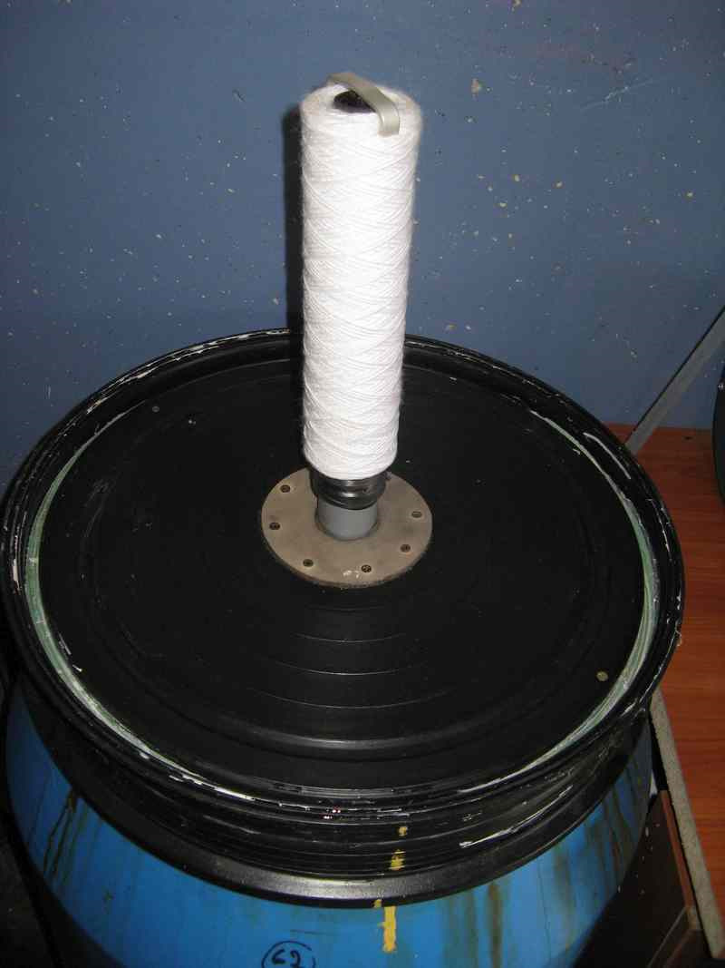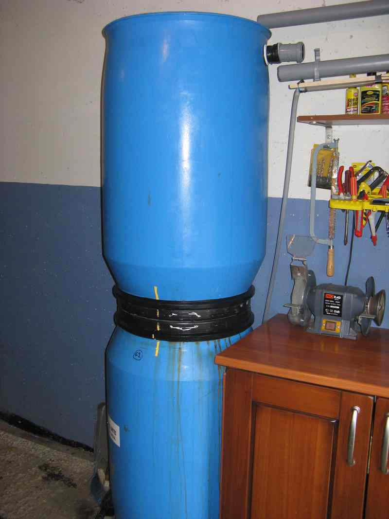 В крышку верхней бочки вставлена трубка, на нее одевается фильтрующий элемент (верхнее отверстие нужно заткнуть чем-нибудь).