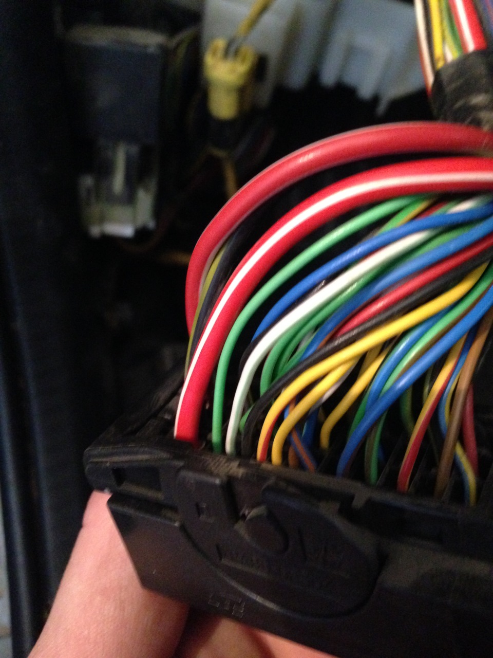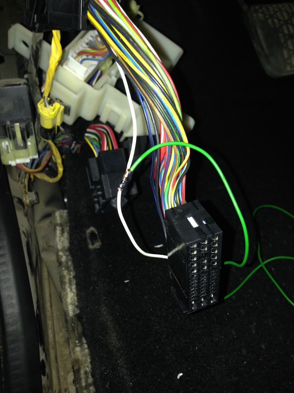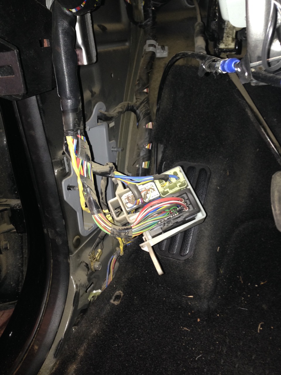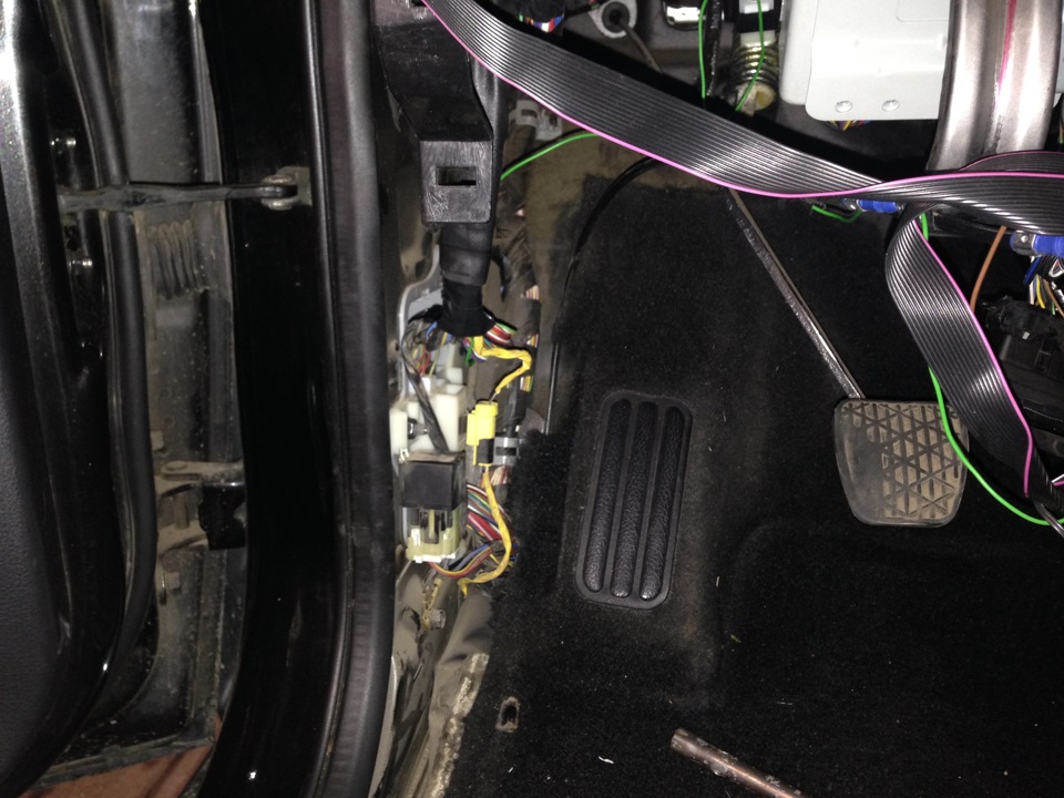 4)Дальше ищем провод ДУТ, вот тут то и возникла проблема.Мне сказали что он входит в колодку со стороны левой ноги, но там ничего не было я очень долго везде искал его, а оказывается он там есть!Просто это колодка за панелью двери.Вот она