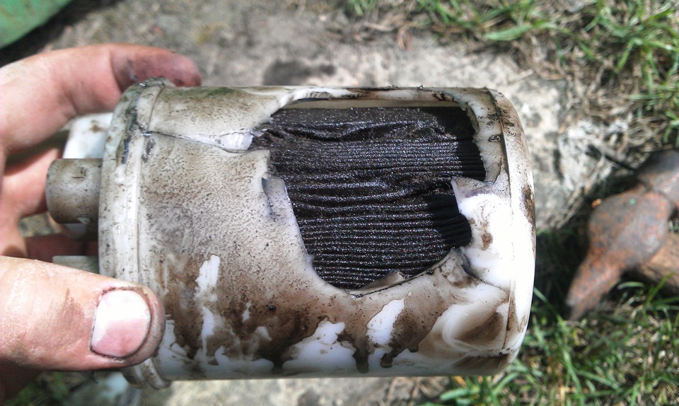 Разбил корпус старого фильтра, а то вытекал бензин цветом похожий на отработанное масло… Каааапец