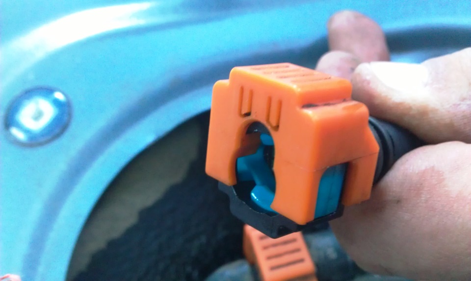 Снимаем топливопровод, поднимаем оранжевый колпачок, нажимаем на зажимы и стягиваем топливопровод! Сольемся примерно 100гр бензина.