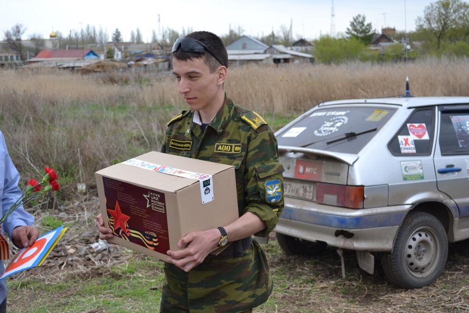 Стуенты с военной кафедры Аэрокосмического университета, вручили провиант купленный на пожертвования участников пробега (гречка, саар, крупы, масло растительно, кофе чай мыло моющие средства), детские открытки, цветы. .