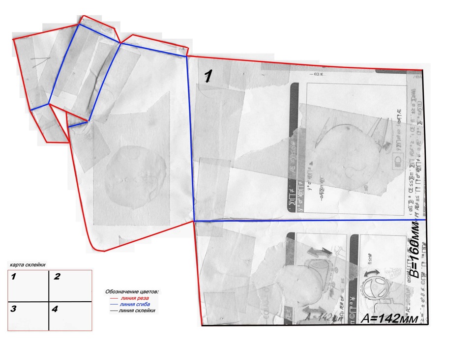 Для изготовления точной выкройки необходимо распечатать фрагменты в масштабе 1:1 (по размерам указанным на линиях реза), достаточно подобрать масштаб печати для одного из изображений и распечатать остальные изображения в том же масштабе (выложенные изображения одинаковы по геометрическим размерам и пропорциям)