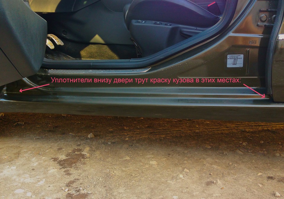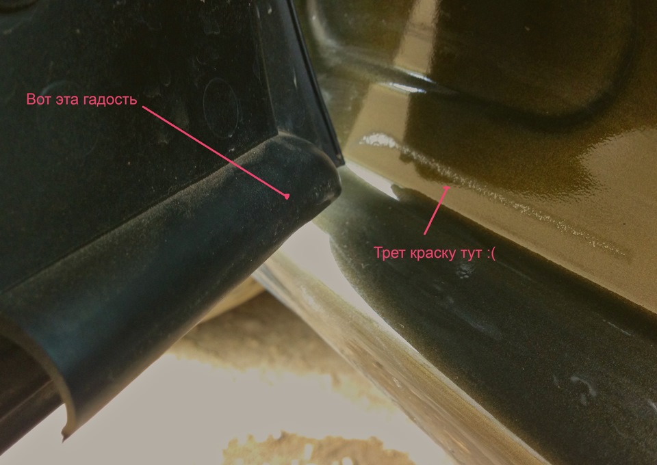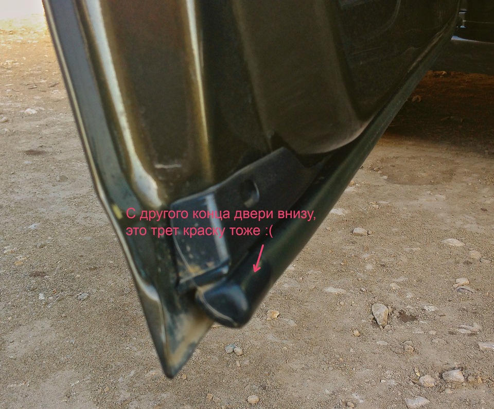 Не знаю замечал ли кто и говорилось ли уже об этом тут ранее, так как не следил долгое время. Но сегодня осматривая машину после осенне-зимне-весеннего сезона на предмет сколов, царапок и тд, чтобы подкрасить и полирнуть, обнаружил что у передних дверей водителя и пассажира, в месте ближе к крылу, стоят твердые уплотнители и очень жестко потерли краску кузова, прямо до грунта:) Так как никаких ремонтов и тд и тп не было, двери не снимали и не разбирали, я так и не понял откуда они могли взяться кроме как от жесткого уплотнителя внизу двери и протирании краски по мере открывания-закрывания дверей. Кстати на другом конце двери, также стоит жестковатый уплотнитель и трет краску в форме небольшого круга на стойке между дверьми(см. фото).
