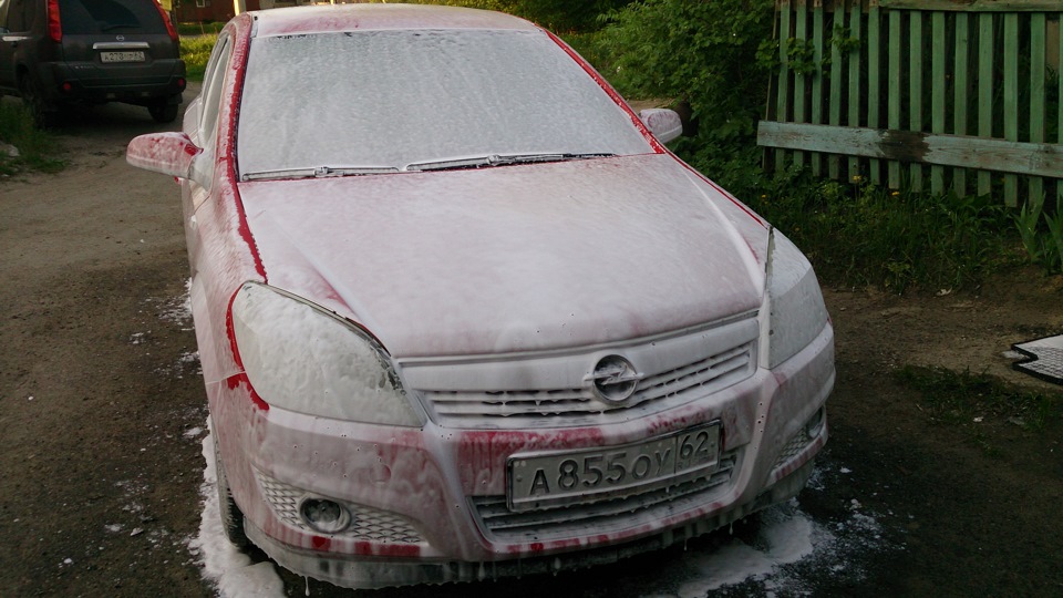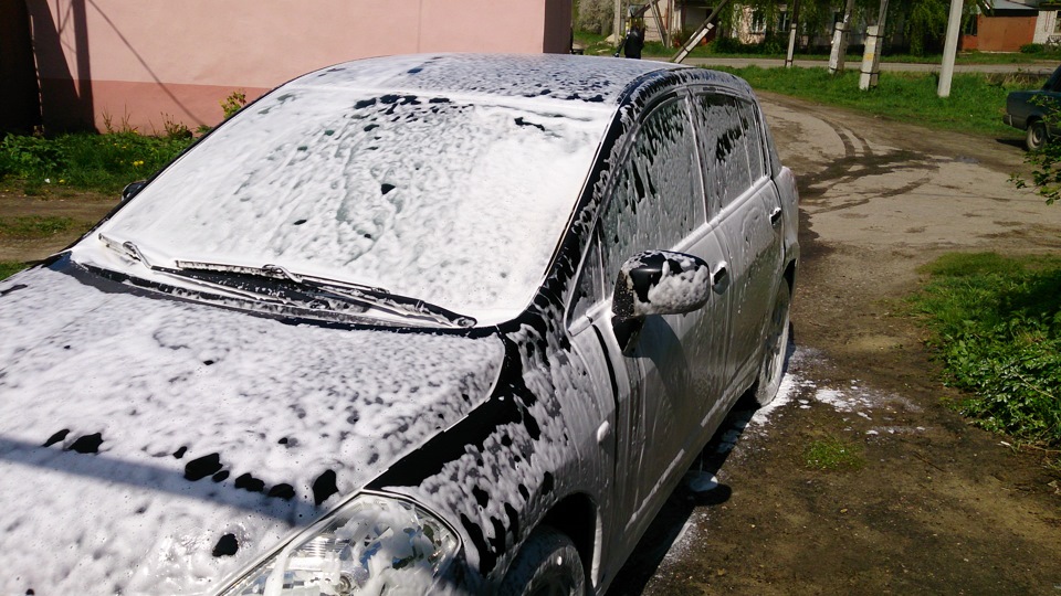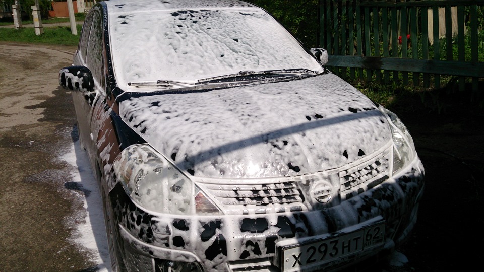 Сейчас же все просто. На сухую с помощью пенокомплекта наносим шампунь для бесконтактной мойки (кстати достался нахаляву, когда покупал насадку), ждем минут 5, пока пена стечет, но не допускаем, чтобы она подсыхала.