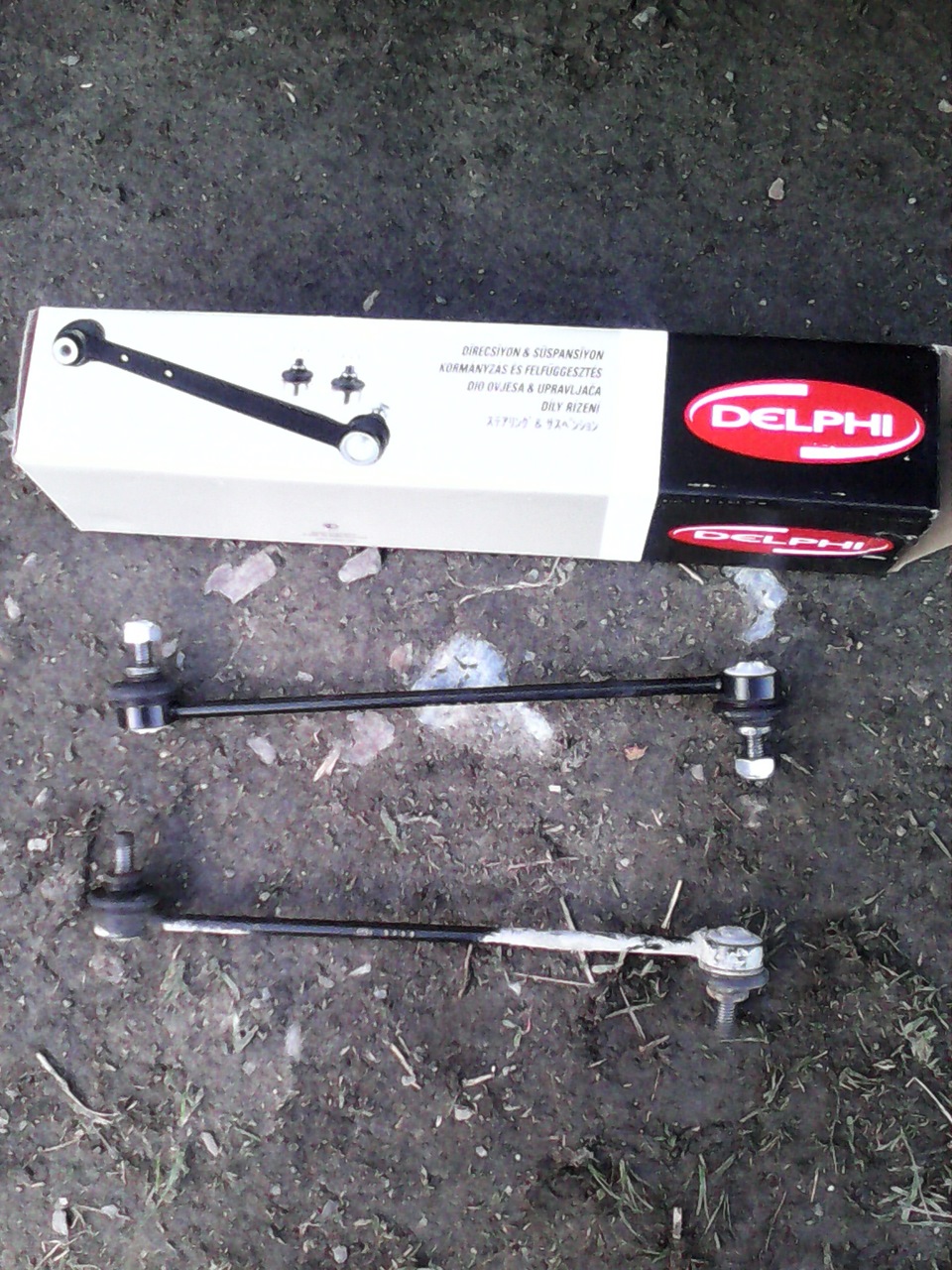 Появился стук на кочках, диагноз показал-правая стойка стабилизатора-Спасибо нашим дорогам. Поиск по магазинам-стойки производства Челябинск, пара 620 рублей, качество неизвестно, название даже не запомнилось, ждал неделю-так и не привезли. В итоге в другом магазине приобретена стойка Delphi за 650 рублей и заменена примерно за 15 минут. Марку старой стойки не смог определить, но если судить по сервисной книжке одна из стоек менялась на 80000 км, т.е хватило всего на 11 т.км. Левая скоро тоже потребует замены, бить не бьет, но люфт уже появился.