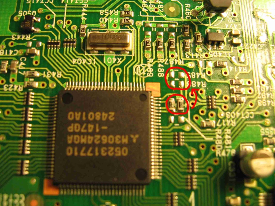 2) Находим резисторы R480 и R481, перепаиваем в рядом стоящие два пустых места. Резисторы очень маленькие, справится профессиональная рука;